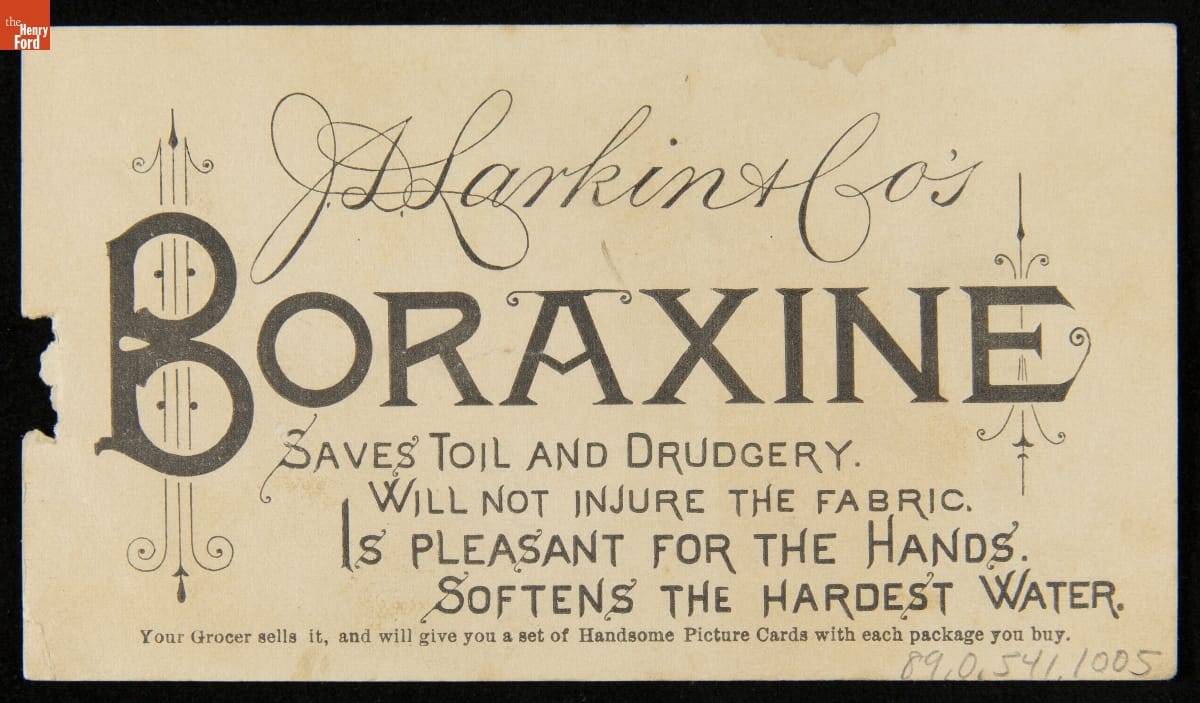 As color printing gained momentum in the late 19th century, advertisers bombarded potential customers with trade cards. Americans enjoyed and often saved the little advertisements found in product packages or distributed by local merchants. J.D. Larkin & Co. began as a soap manufacturer before producing a wide variety of products as the Larkin Company. This trade card features J.D. Larkin's popular soap product, Boraxine.