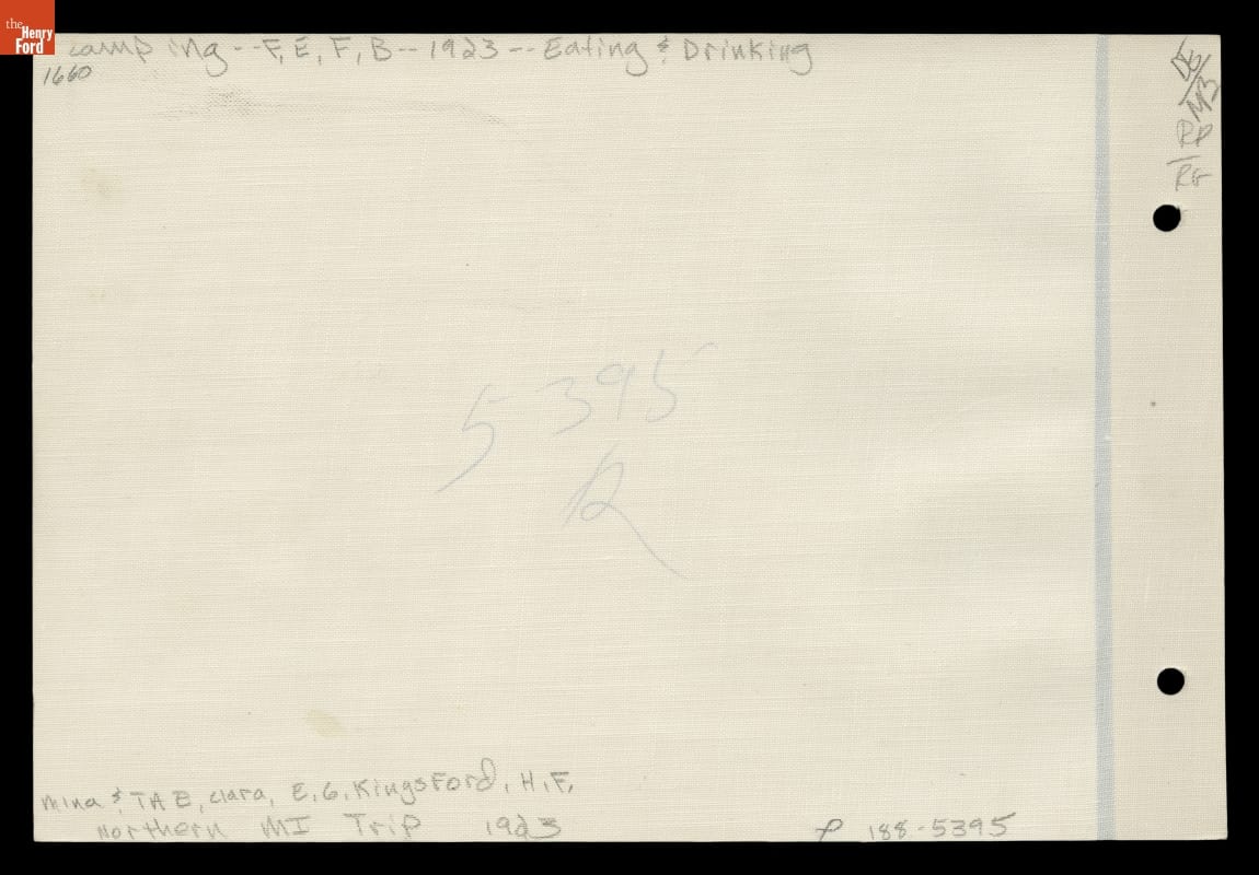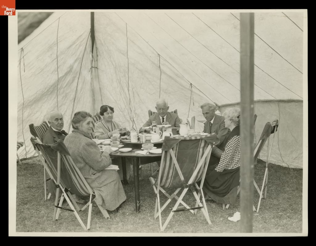 Between 1916 and 1924, Henry Ford, Thomas Edison, Harvey Firestone and John Burroughs embarked on a series of camping trips. They called themselves the Vagabonds, but they camped in style. In 1923, Ford, Edison, Firestone and their wives -- Burroughs had died in 1921 -- traveled to northern Michigan. This photo shows part of the group with their invited guest, Edward Kingsford, eating breakfast.