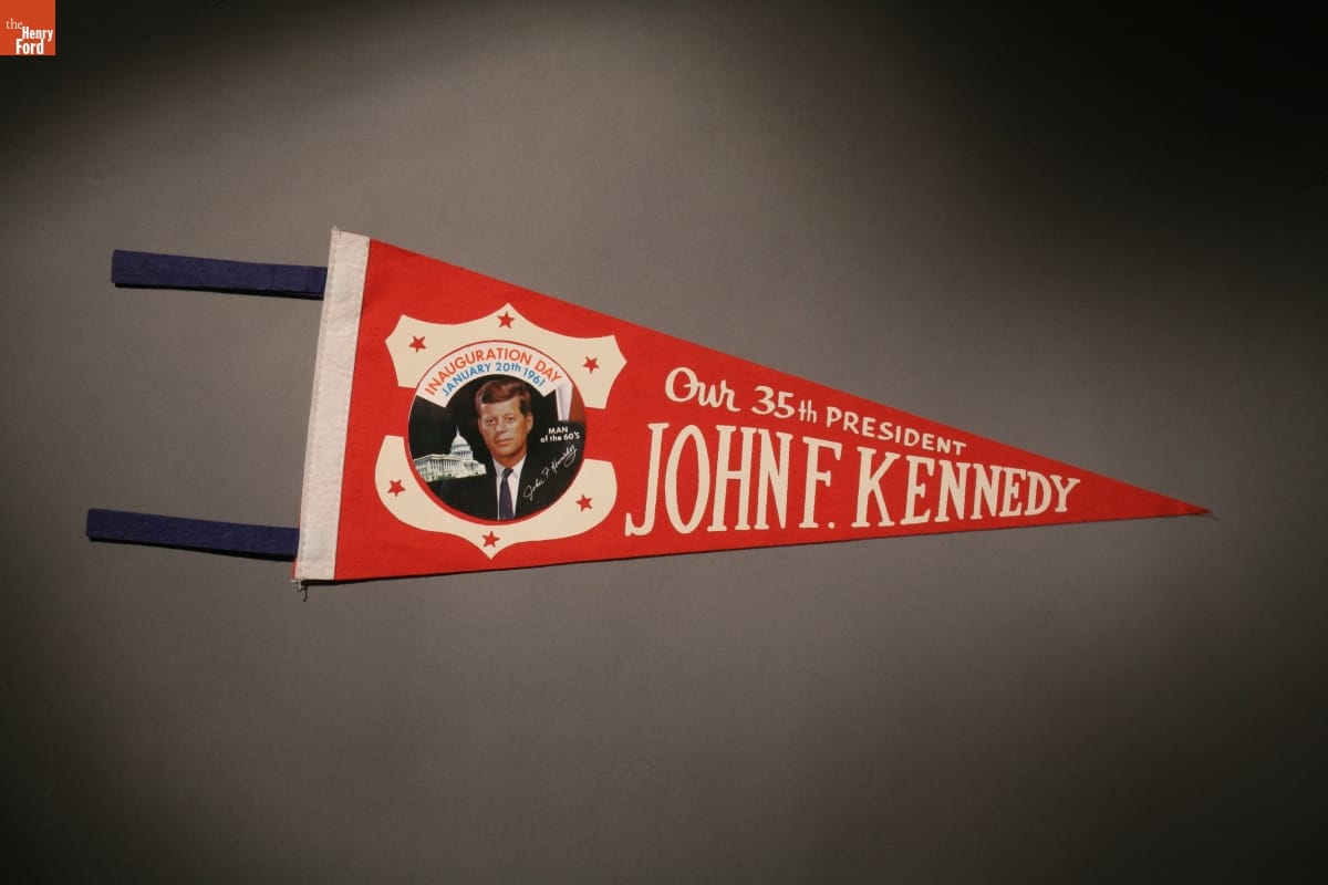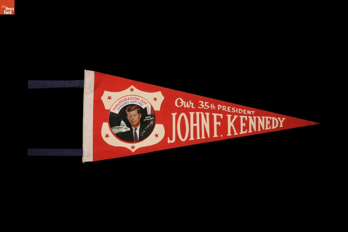 John F. Kennedy won the 1960 presidential election by a razor-thin margin, but after taking office he received the support of most Americans. Standing on the Capitol steps on the cold morning of January 20, 1961, with supporters proudly waving pennants like this, Kennedy was sworn in as President and delivered what has come to be considered a classic Inaugural Address.