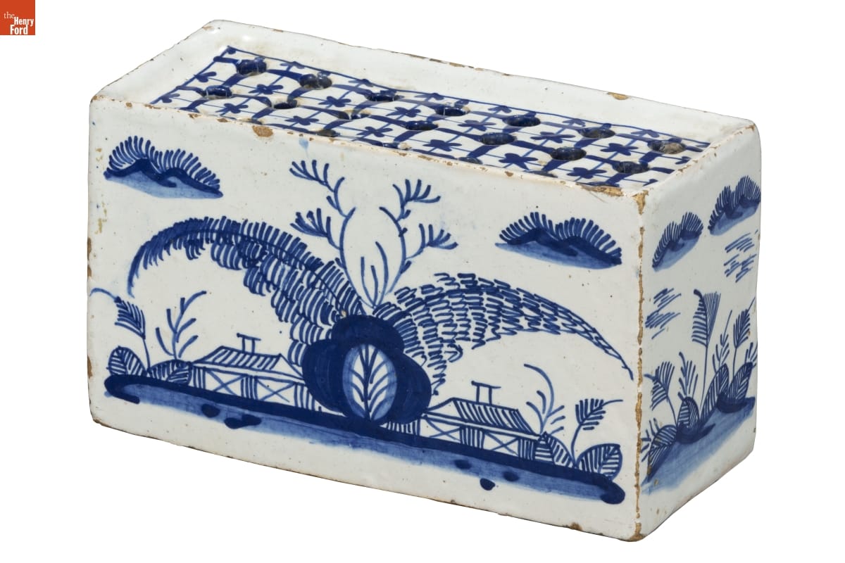 Wealthy and well-to-do individuals in the mid-18th century used a flower brick to display cut flowers. This blue and white decorative container--meant to imitate expensive Chinese export porcelain--not only held flowers but also revealed the owner's good taste and the lifestyle to which the household aspired.