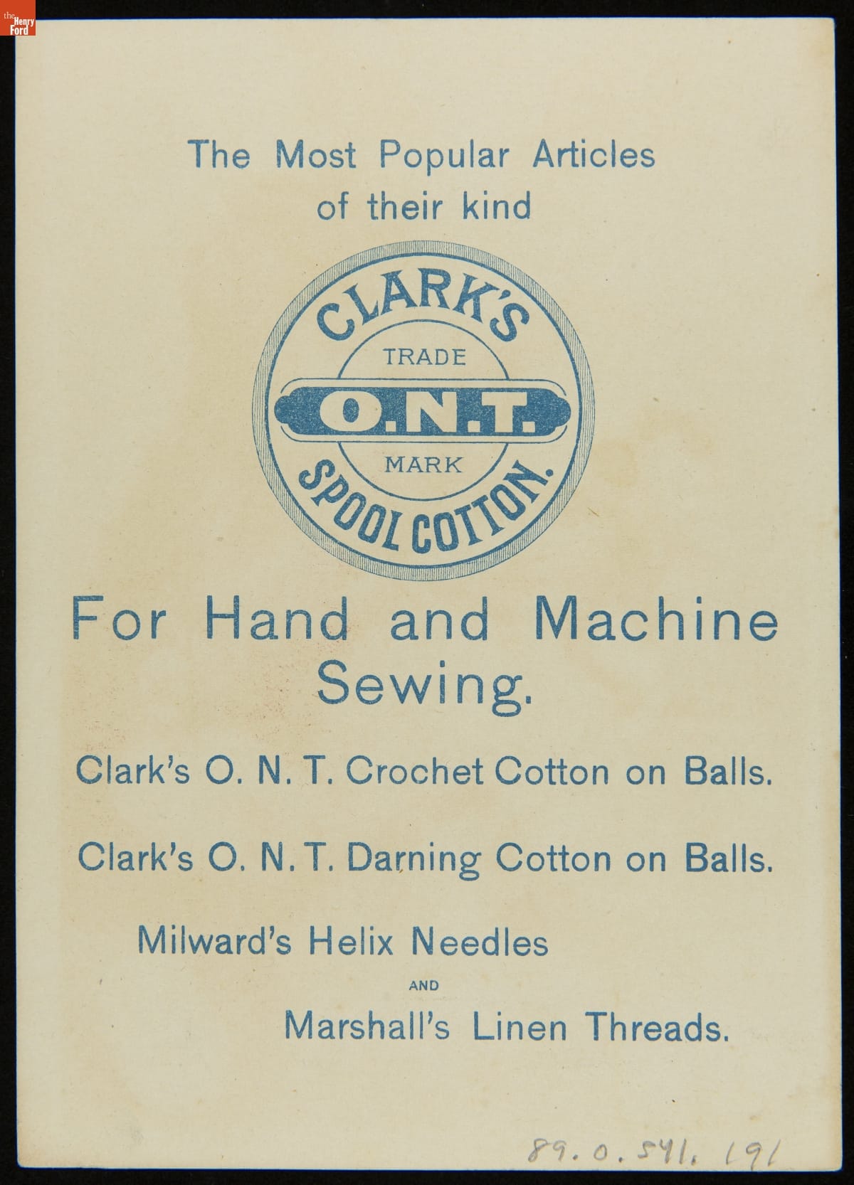 Trade Card for Clark's O.N.T. Spool Cotton Thread, 1890