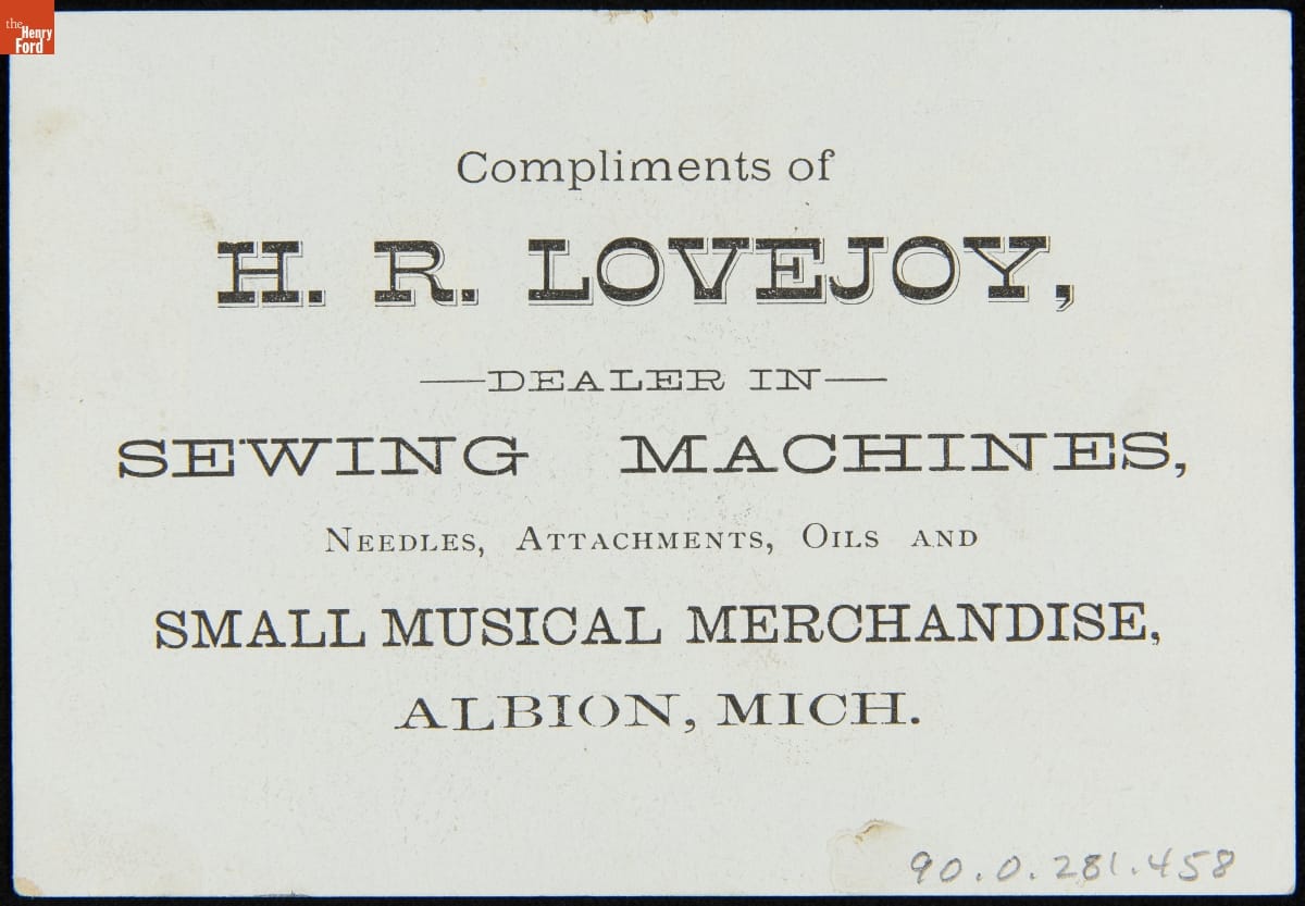 Manufactured by White Sewing Machine Company, Cleveland, Ohio. Retailed by H.R. Lovejoy, Albion, Michigan. Lithographed by Johns & Company.