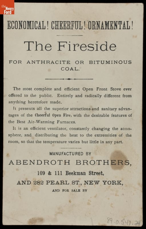 Trade Card for the Fireside Stove, Abendroth Brothers, 1870-1900