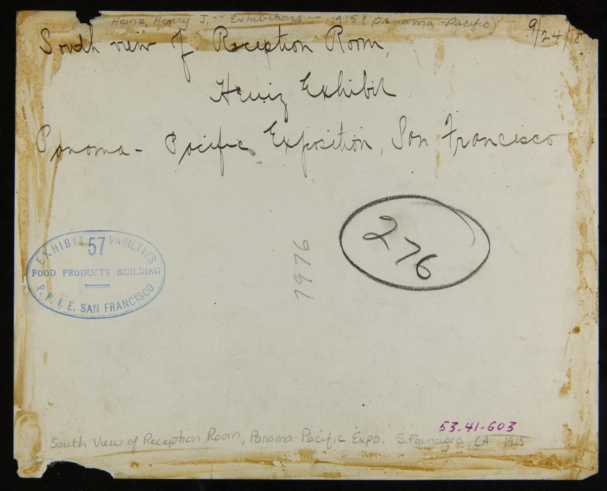 The H. J. Heinz Company participated in world's fairs, regional fairs and expositions. Heinz exhibits included product displays and samples, slide shows of the Heinz complex in Pittsburgh, Pennsylvania, and pickle-pin souvenirs--all set in a refined drawing-room atmosphere. This photograph features the reception room for the Heinz exhibition building at the Panama-Pacific International Exposition in San Francisco, California, in 1915.