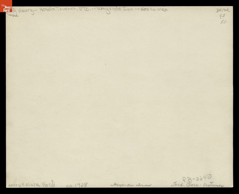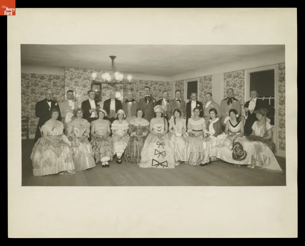 Having attended many of Henry Ford's old-fashioned dancing parties, some of Ford's guests decided to give a special dinner party in honor of Henry and Clara Ford. Everyone dressed in historical costumes and enjoyed dinner at the Clinton Inn (now Eagle Tavern) in Greenfield Village, where they posed for this photograph. Then they proceeded to nearby Lovett Hall for dancing.
