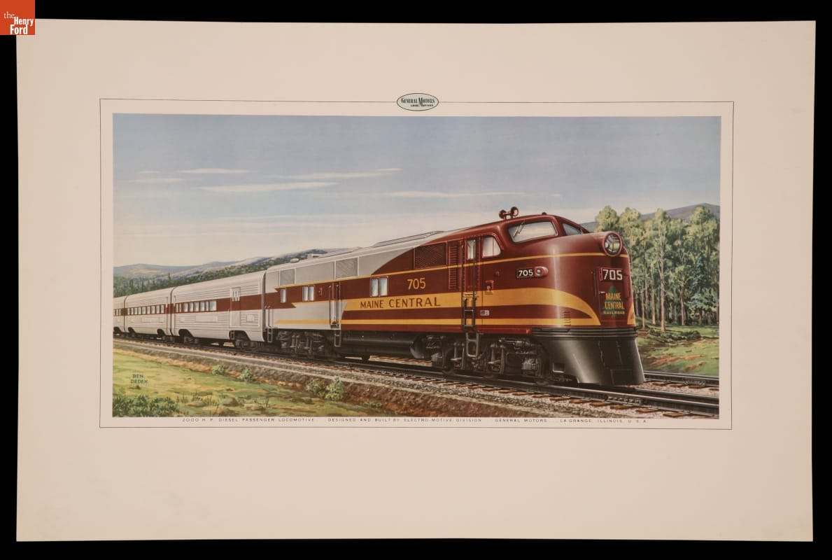 From 1941 to 2005, General Motors produced diesel-electric locomotives through its Electro-Motive Division (EMD) subsidiary, headquartered in La Grange, Illinois. This lithograph features a 2,000-horsepower EMD E7A locomotive leading a Maine Central Railroad passenger train. Diesel locomotives required less maintenance and fewer crew members than their steam counterparts, which led to their widespread adoption after World War II.