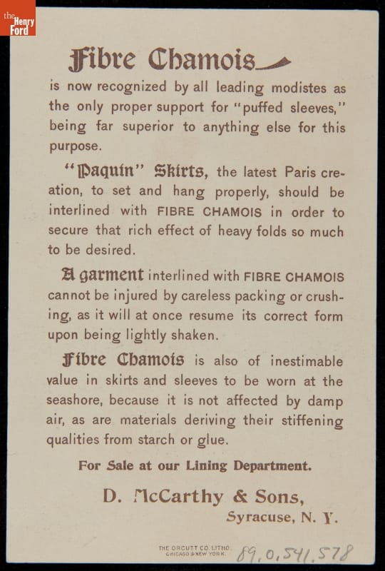 Trade Card for D. McCarthy & Sons Department Store, "Fibre Chamois: An Ideal Dress Lining," circa 1900