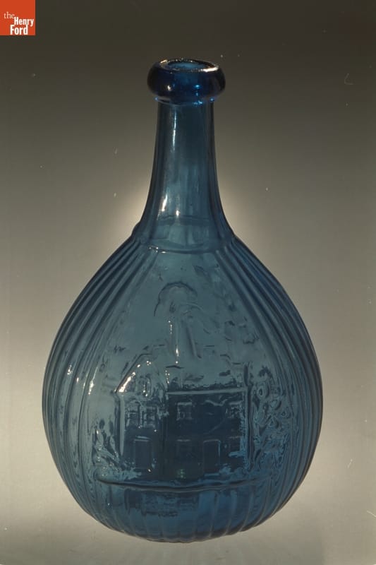 Glass factories in America began producing inexpensive, mold-formed flasks in the early 1800s. These figured flasks, often decorated with symbols of national pride, appealed to America's common man. The Swedish singer, Jenny Lind, caused a sensation when she toured America from 1850-1852. Her name and image adorned a number of everyday objects -- like this flask -- for years to come.