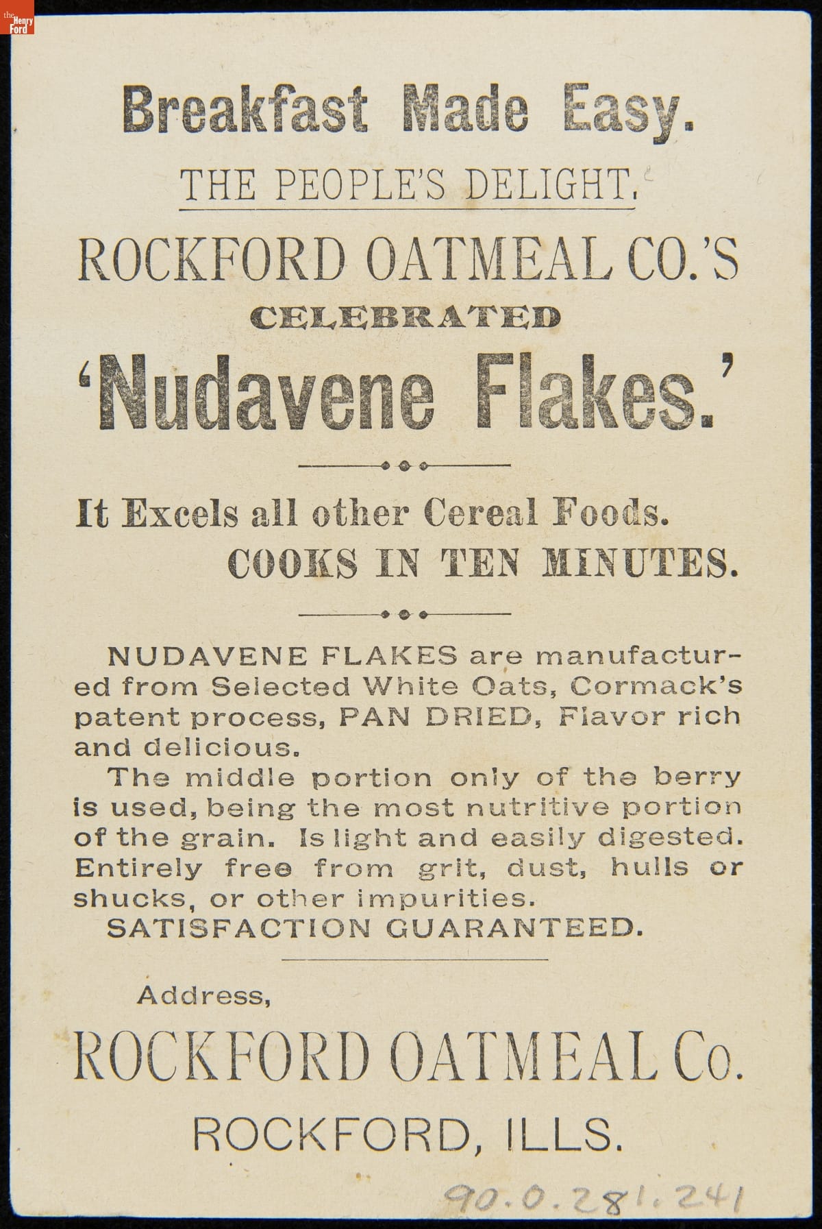Trade Card for Nudavene Flakes, Rockford Oatmeal Co., 1891-1900
