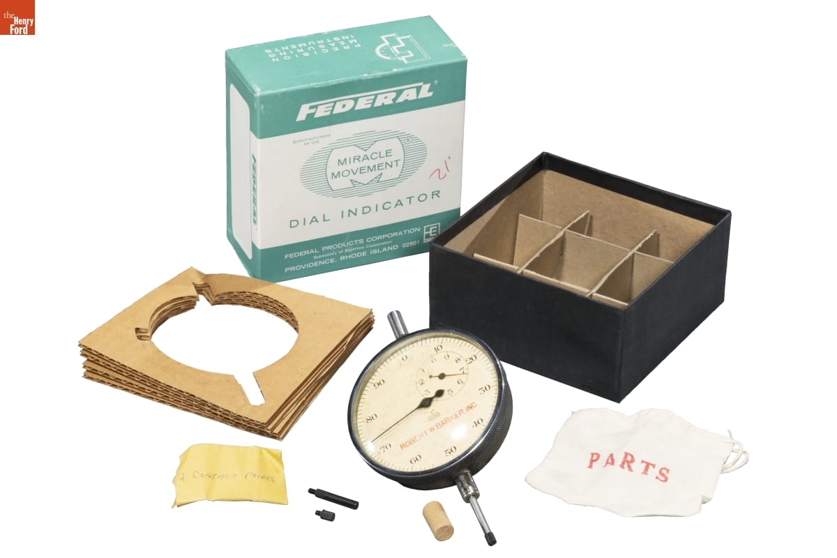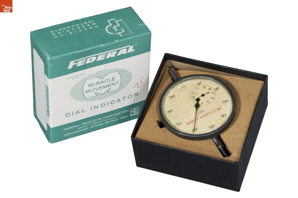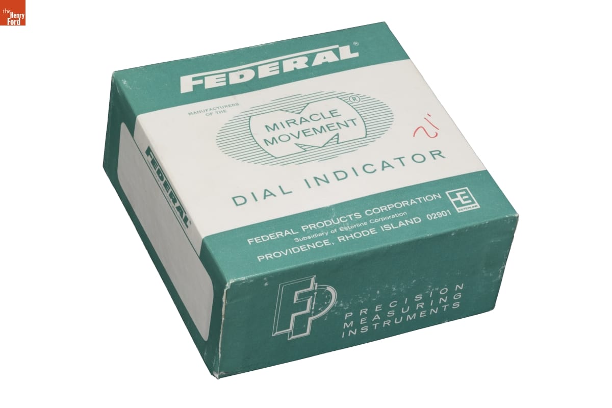 Dial indicators provide accurate measurements of parts used in a number of manufacturing processes. The large numbers on the indicator's face make small, imperceptible dimensions visible. Operators compare these measurements against a standard and make corrections if any deviation is found. The Federal Products Corporation made a variety of precise measuring devices in the 20th century.