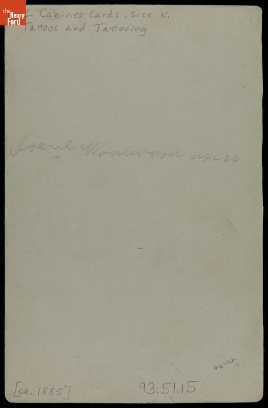 Irene Woodward, also known as "La Belle Irene," is pictured in this cabinet card. During Woodward's stage career, she billed herself as "The Original Tatooed Lady," appearing at Bowery district dime museums like Bunnell's, and went on tours of Europe. Woodward's tattoos were inked by tattoo pioneer Samuel O'Reilly and his apprentice, Charles Wagner.