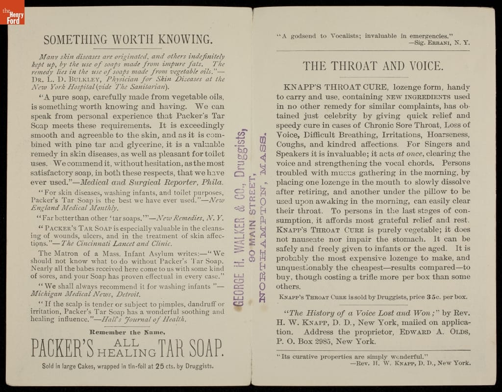 Trade Card for Knapp's Throat Cure and Packer's All Healing Tar Soap, H. W. Knapp, Packer Manufacturing Co., 1882