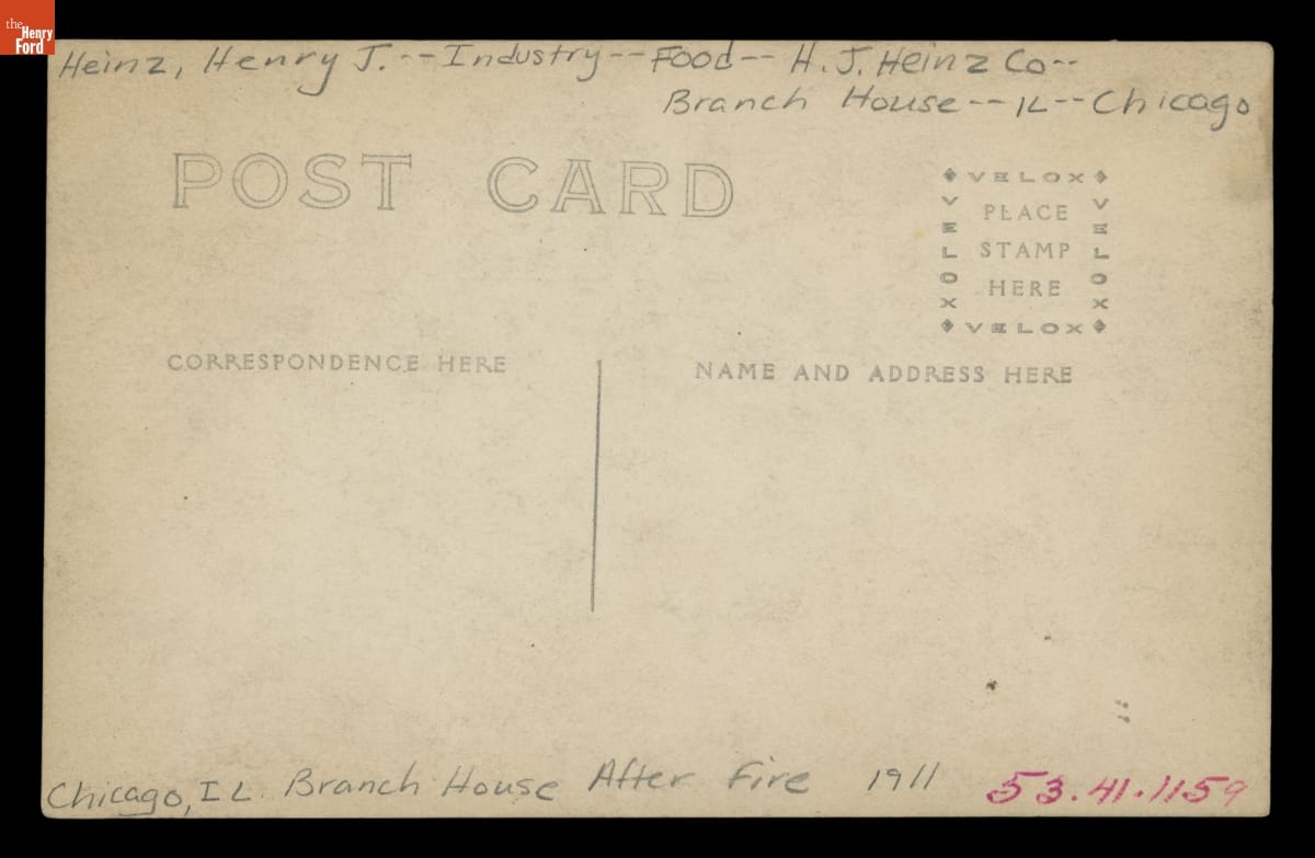 This photograph shows the scene of a destructive fire at a H.J. Heinz Company branch house in Chicago, Illinois, in 1911. Fire was a constant threat to factories and industrial facilities. Firefighters focused their efforts on saving lives, controlling the fire, and preventing damage to nearby buildings.