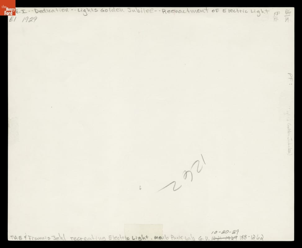 To celebrate the 50th anniversary of the incandescent electric lamp, Henry Ford hosted the Light's Golden Jubilee in Dearborn, Michigan. Ford chose the occasion to dedicate Greenfield Village to his friend, Thomas Edison. During the festivities, Edison and former assistant Francis Jehl re-enacted the first successful light bulb test (1879) in Greenfield Village's detailed reproduction of Edison's Menlo Park Laboratory.
