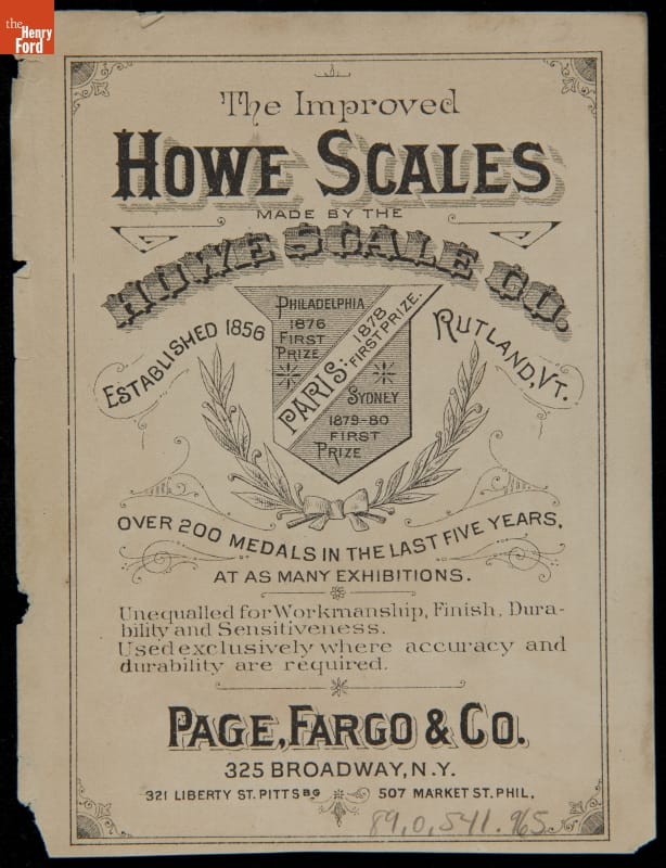 Advertised products made by Howe Scale Co., Rutland, Vermont. Retailed by Page, Fargo & Co., New York, New York