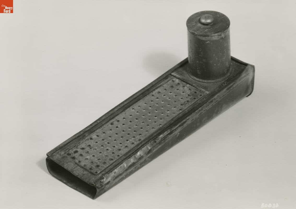 Nutmeg comes from the seed of an evergreen tree native to the Spice Islands of Indonesia. The spice was once highly prized and expensive, but by the mid-1800s, nutmeg was readily obtainable and affordable. Many Victorian American kitchens would have contained a nutmeg grater, like this one, which uses a file-like surface to create the culinary seasoning powder.