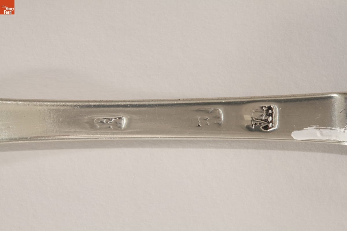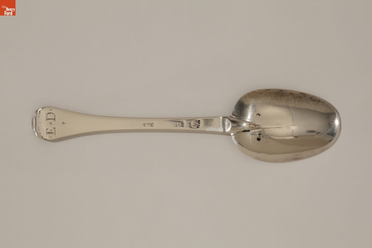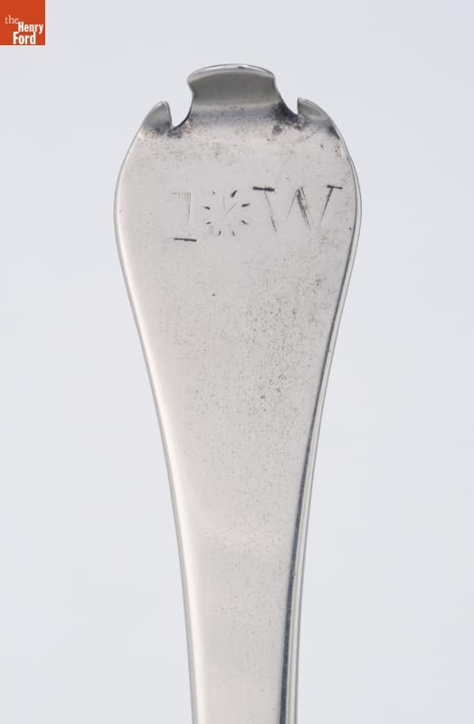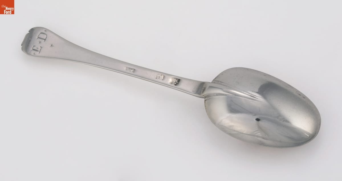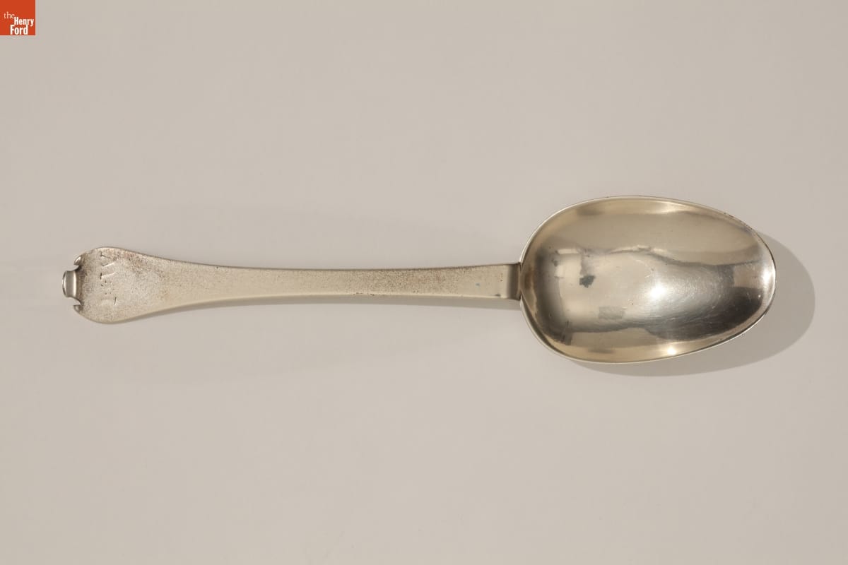 The notched handle and "rat tail" support on the underside of the fig-shaped bowl classify this as an English trefid spoon. Before new production methods and domestic manufacture after the turn of the 18th century, a single silver spoon carried across the ocean was a rare and treasured belonging in American households.