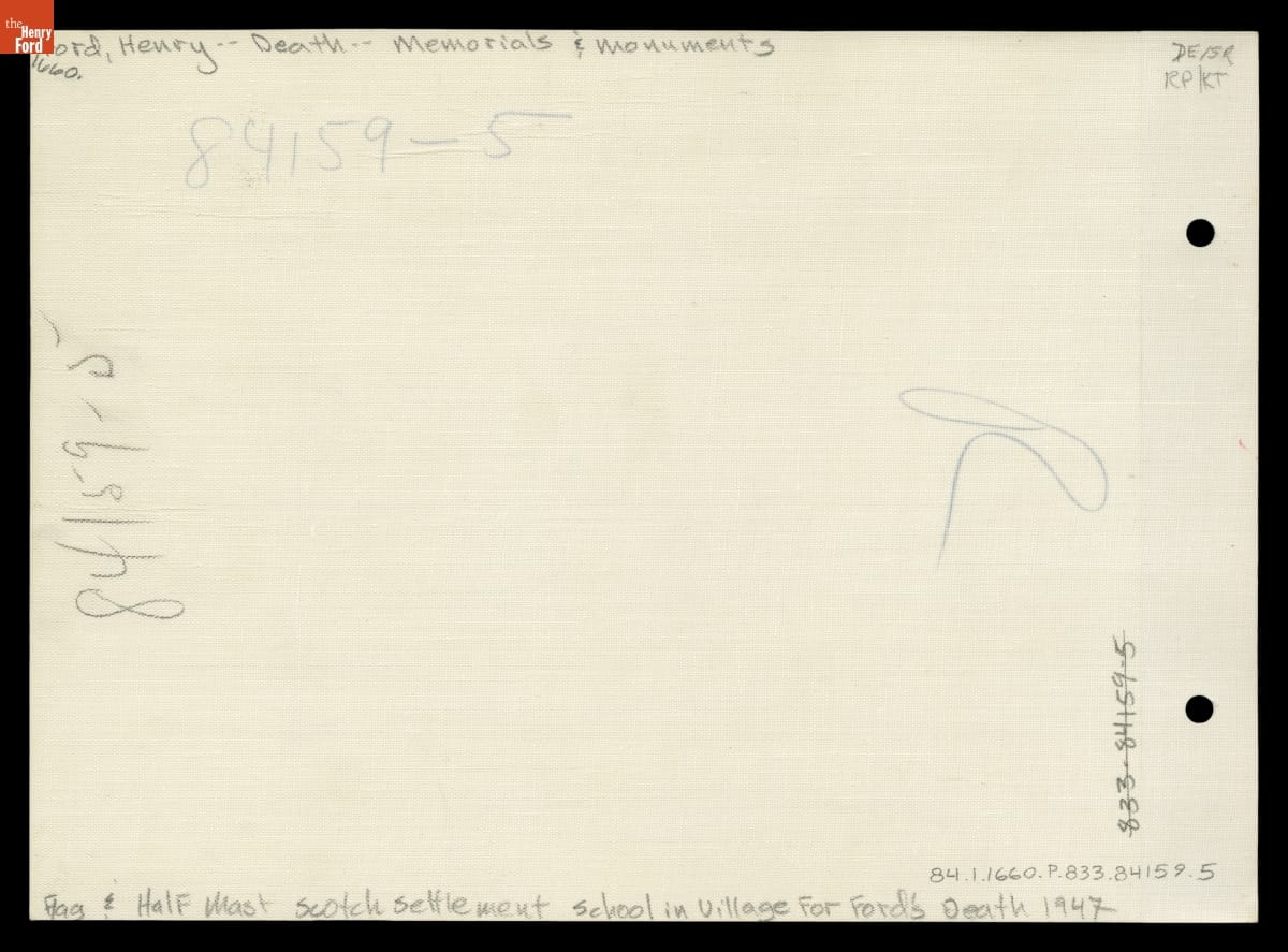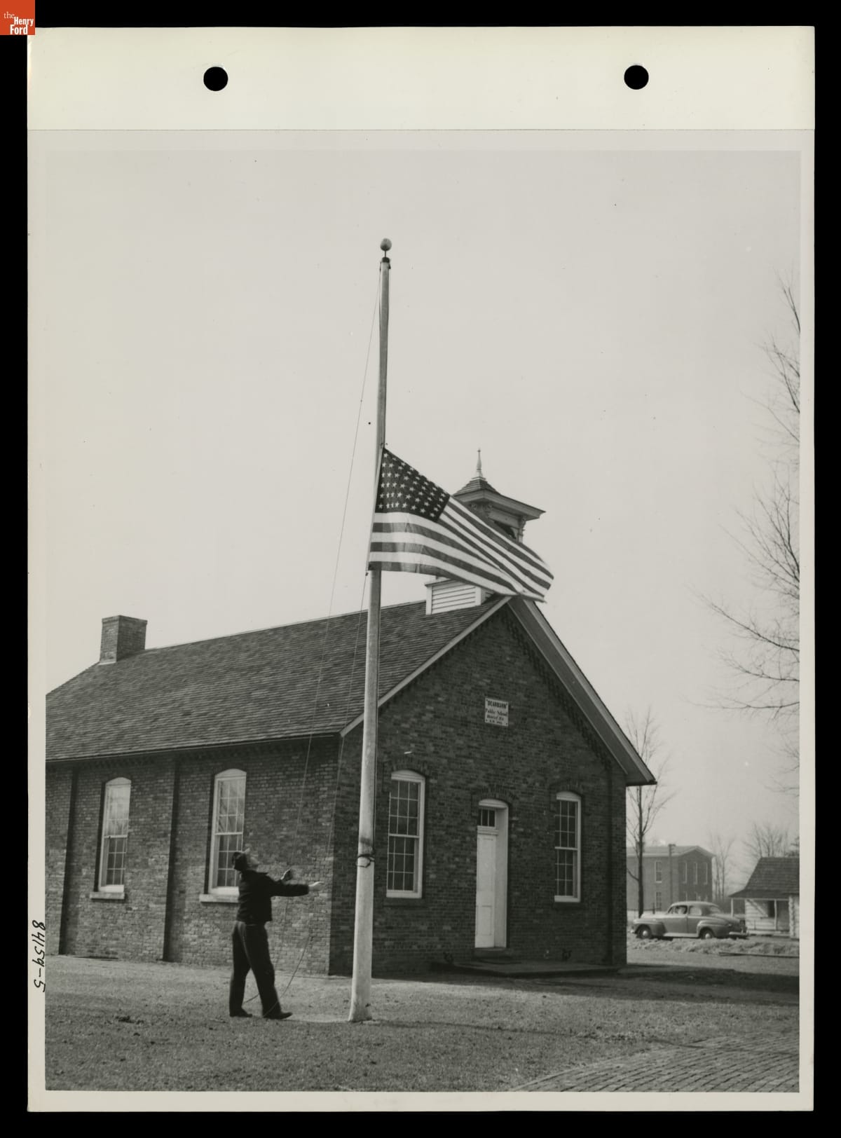 Henry Ford passed away at age 83 on April 7, 1947. This photo shows a student at the Edison Institute School lowering the flag in Ford's memory at Scotch Settlement School in Greenfield Village. When Ford's body lay in repose at nearby Lovett Hall, people waited in a mile-long line to pay their respects to the automotive pioneer.