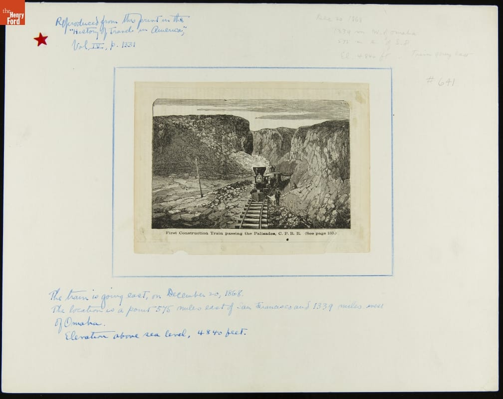 Central Pacific Railroad construction crews reached Nevada's Palisade Canyon in 1868. The canyon, formed by the Humboldt River, provided a pathway for the railroad's eastward push to Utah. The community of Palisade, located within the canyon, became a busy transfer point between the Central Pacific and smaller railroads serving area mining camps.