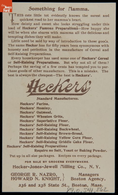 Advertised products made by Hecker-Jones-Jewell Milling Co., New York, New York. Card lithographed by Giles Company in New York