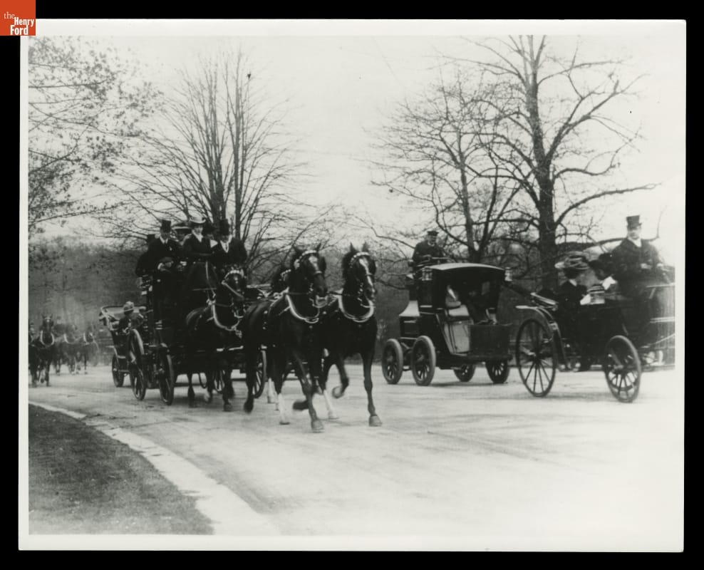 Riker or Columbia Electric Car Passing Coach and Four, Central Park, New York City, circa 1900