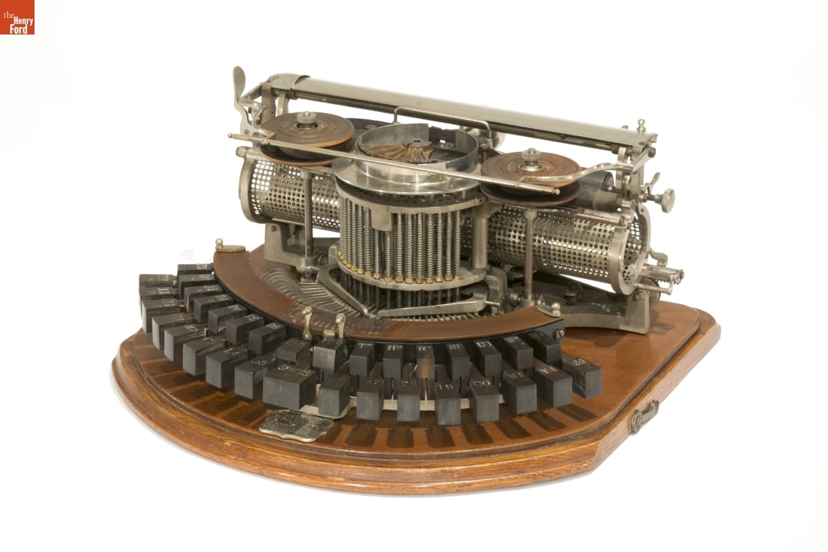 In the 1880s and 1890s, the demand for office machines led to an incredible flowering of typewriter technologies. Inventor James Bartlett Hammond of New York developed an innovative "type shuttle" for his typewriters which moved type cleanly and efficiently with few moving parts. The Hammond's unusual design was successful, and these portable, elegant typewriters were manufactured for half a century.