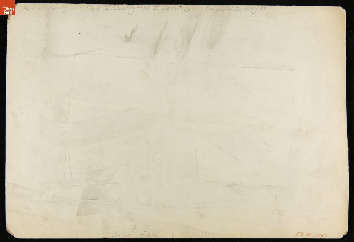 Before complete mechanization of the manufacturing process, many tasks at the Heinz factory were done by hand. Photographs of this process were often taken and then modified for advertising and publications. Pictured here are employees harvesting onions in an onion field.