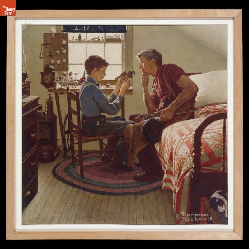 Norman Rockwell created eight paintings for Ford Motor Company's 50th Anniversary calendar project. Four of the paintings highlighted Henry Ford's past and his impact on the larger world, while the others focused on Ford Motor Company's present and future. In this painting, the young Henry Ford shows a skeptical village blacksmith his concept for an automobile.