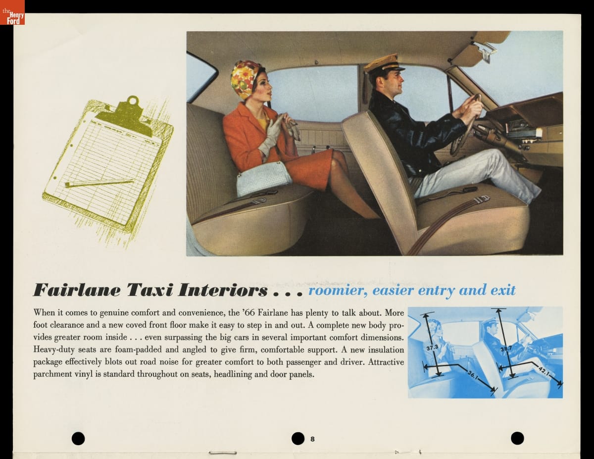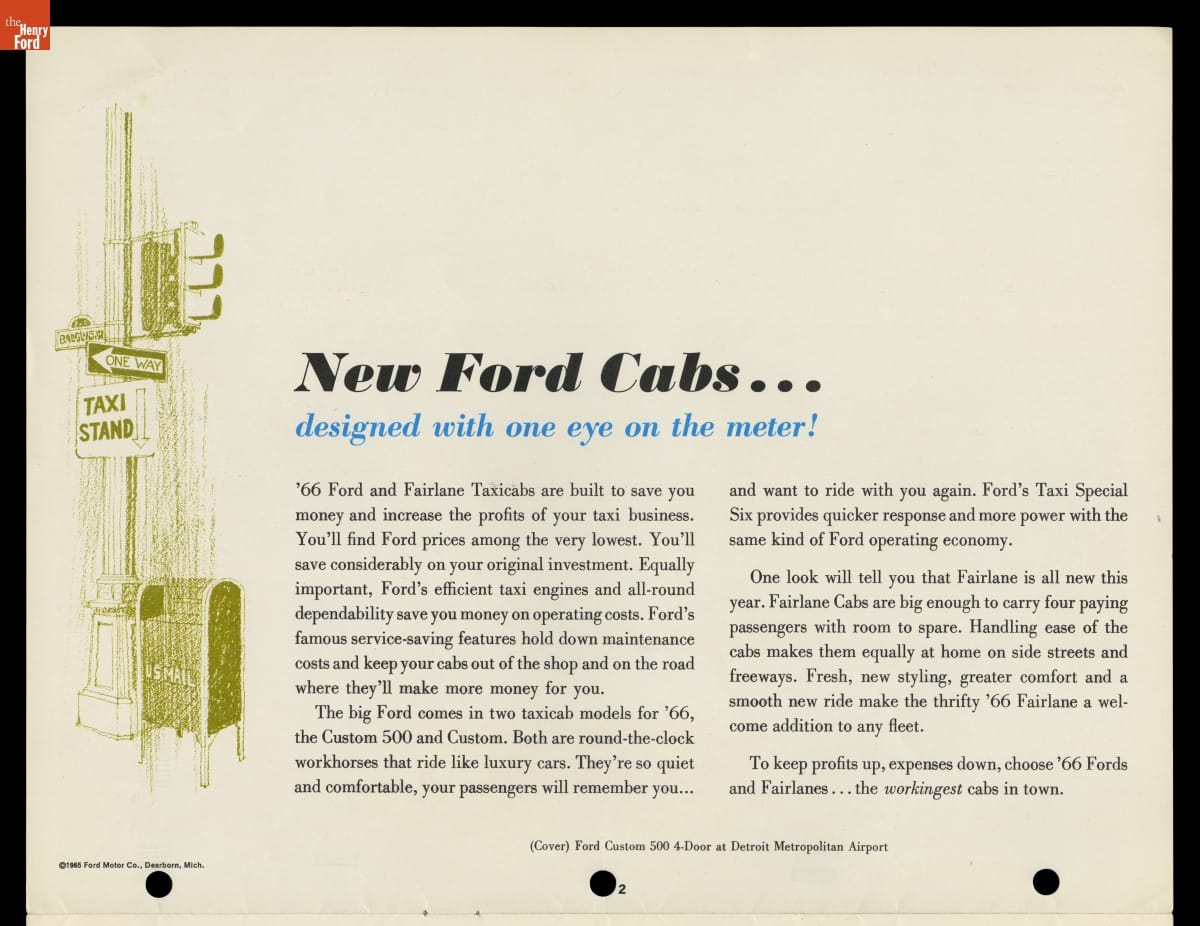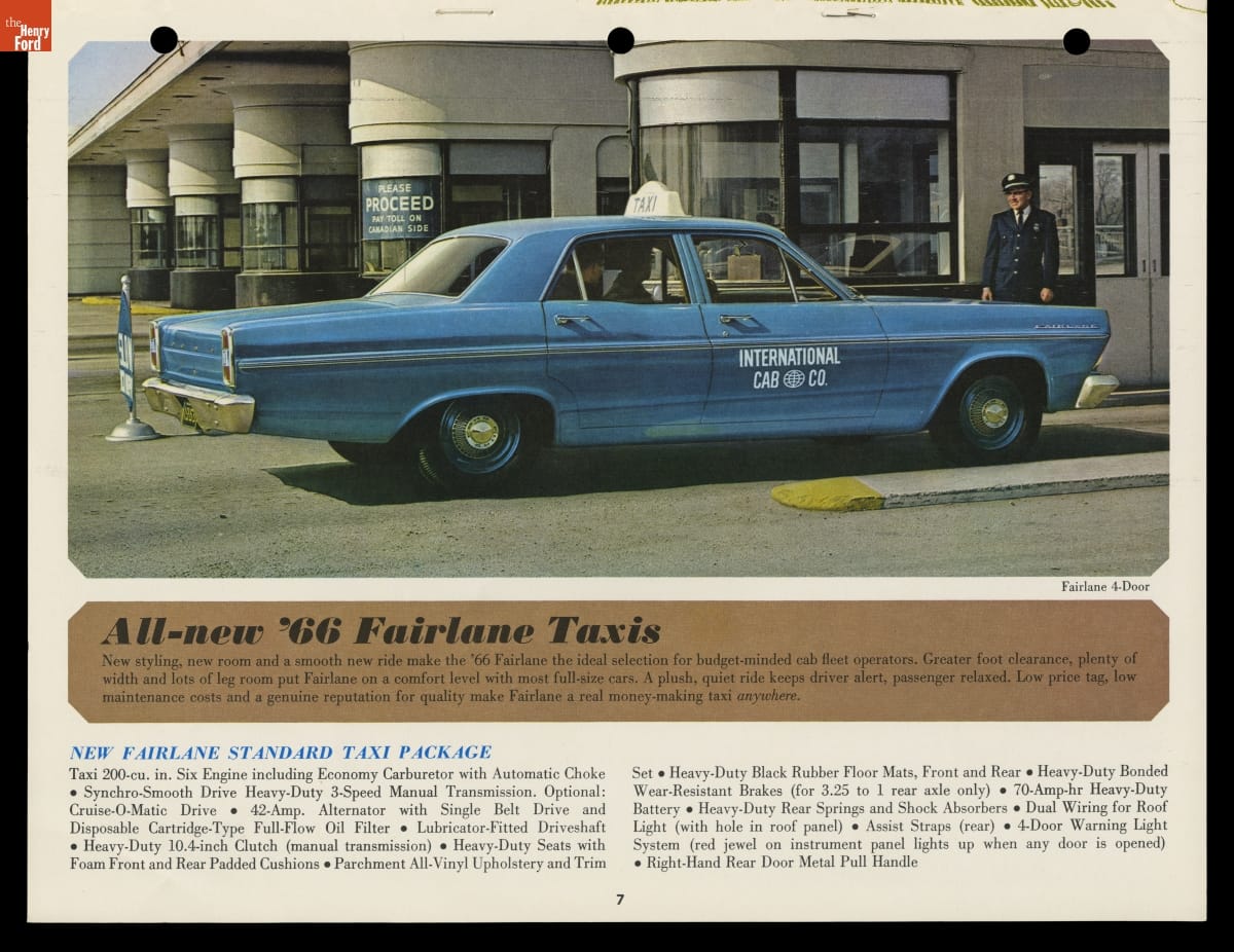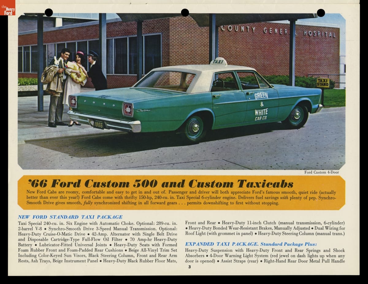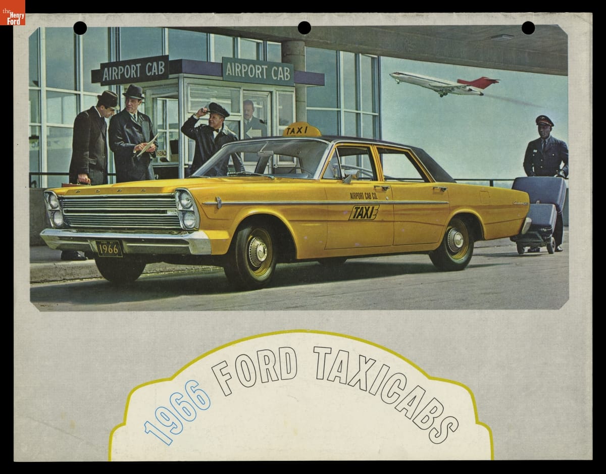 In this brochure, Ford Motor Company showcased its 1966 models available for taxicab service. The booklet emphasized roomy interiors, spacious trunks and heavy-duty components that appealed to taxi operators, drivers and customers alike. Competition from major automakers like Ford ultimately pushed specialist taxi manufacturers like Checker Motors Corporation out of business.