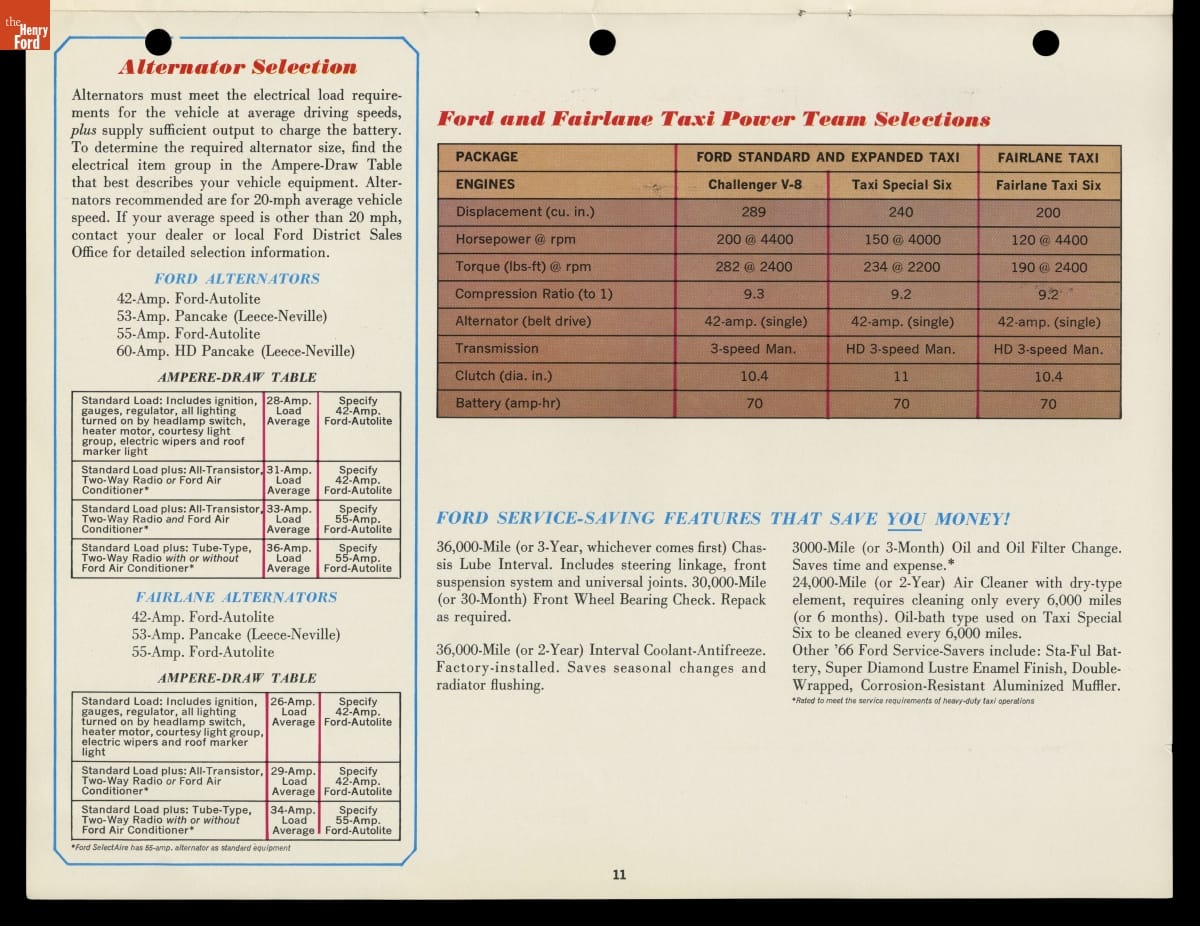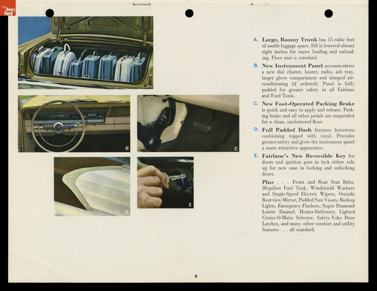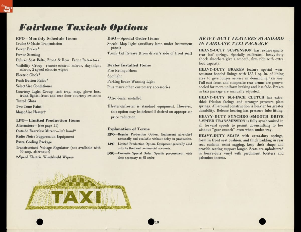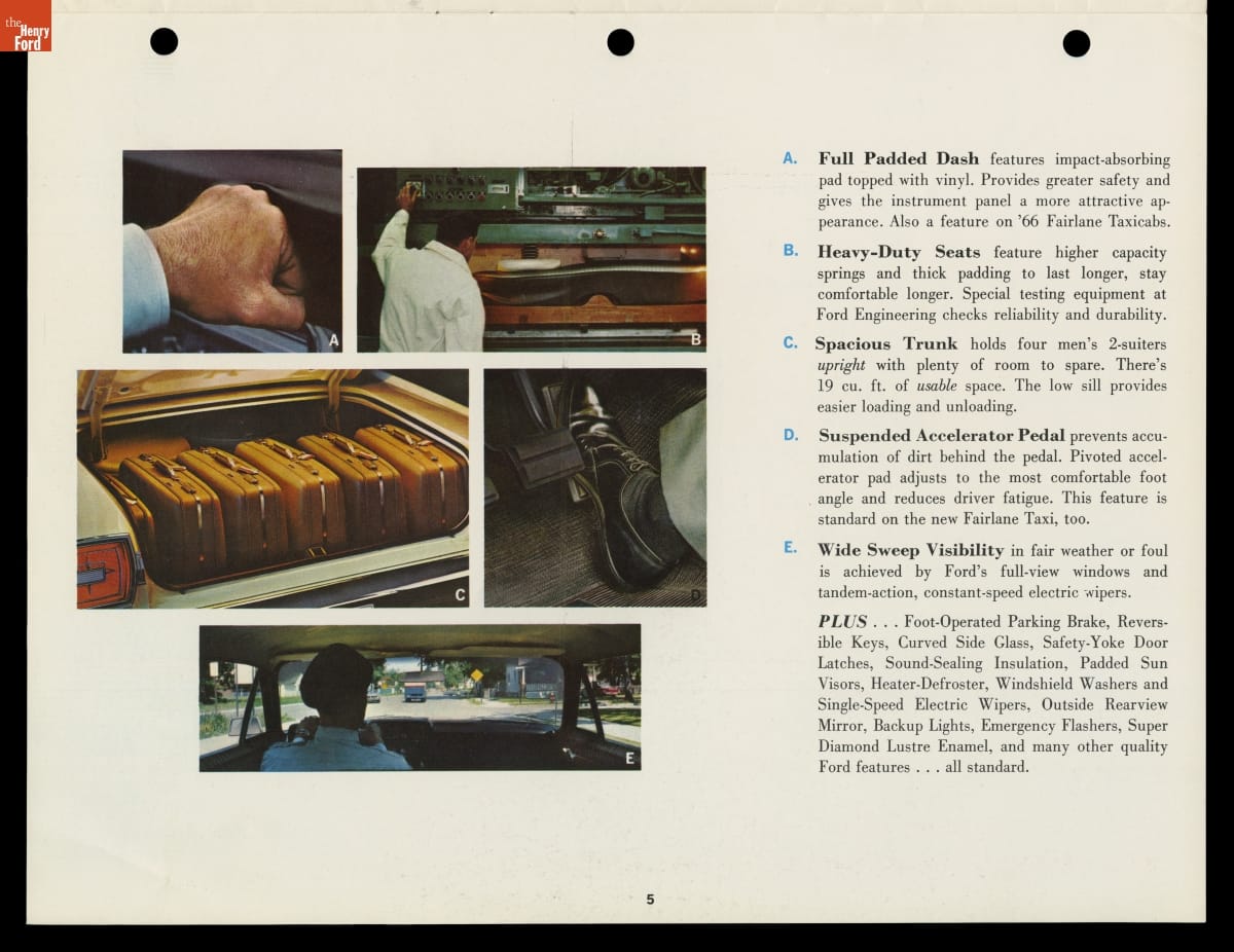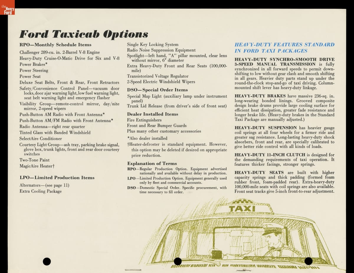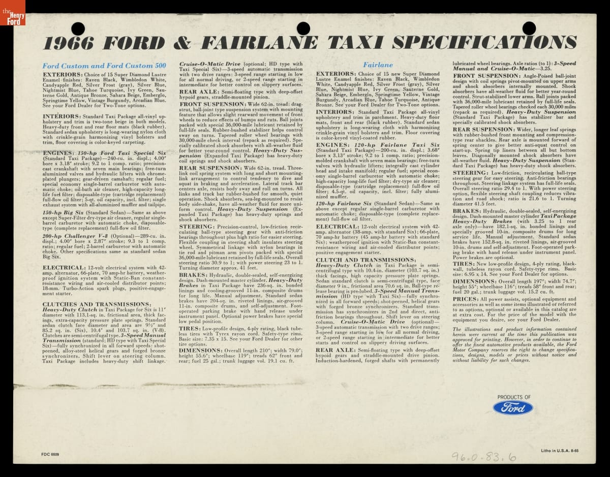 In this brochure, Ford Motor Company showcased its 1966 models available for taxicab service. The booklet emphasized roomy interiors, spacious trunks and heavy-duty components that appealed to taxi operators, drivers and customers alike. Competition from major automakers like Ford ultimately pushed specialist taxi manufacturers like Checker Motors Corporation out of business.