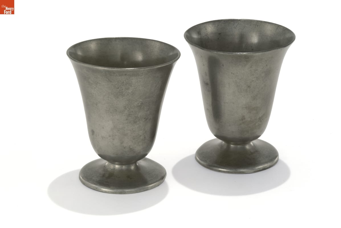 Beakers are tapered drinking vessels without a handle that often have a flared mouth or base. Pewter examples from the late 18th and 19th centuries could be found in the homes of Americans of modest means. They were also used in taverns and inns or in churches where they served as communion cups.