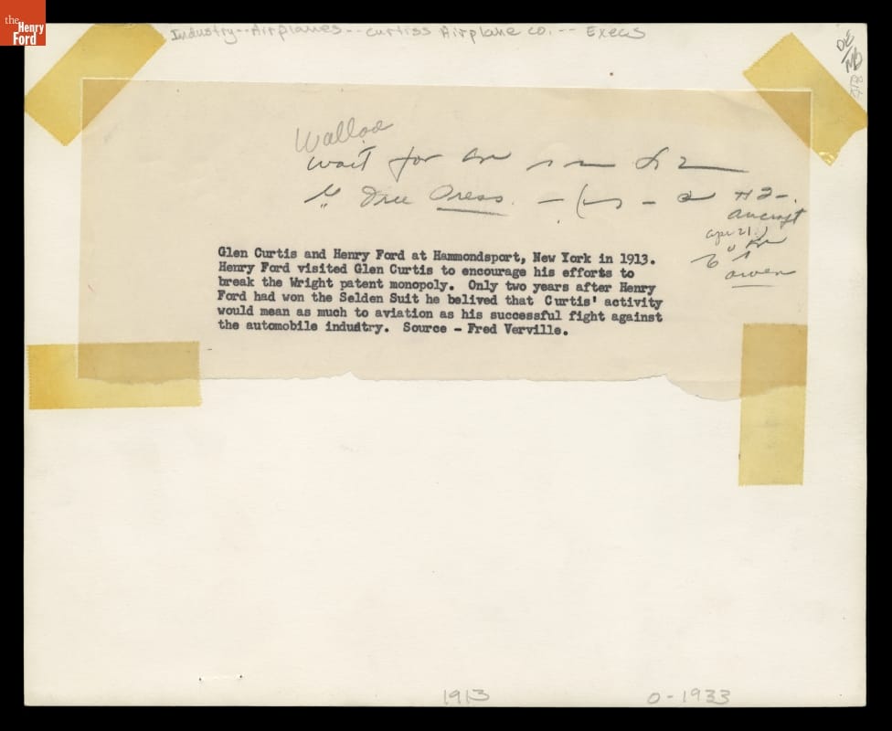 Henry Ford felt something of a kinship with aviation pioneer Glenn Curtiss. When this photo was taken in 1913, Curtiss was locked in a bitter patent dispute with the Wright Company, despite Curtiss's aileron control method being mechanically different from the Wright brothers' wing-warping technique. The fight reminded Ford of his own difficult struggle against the Selden automobile patent.