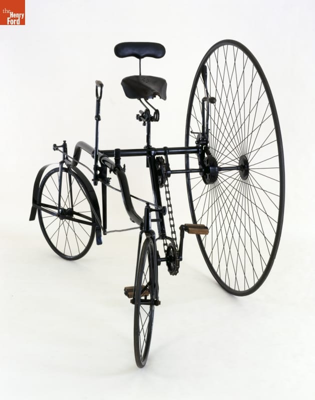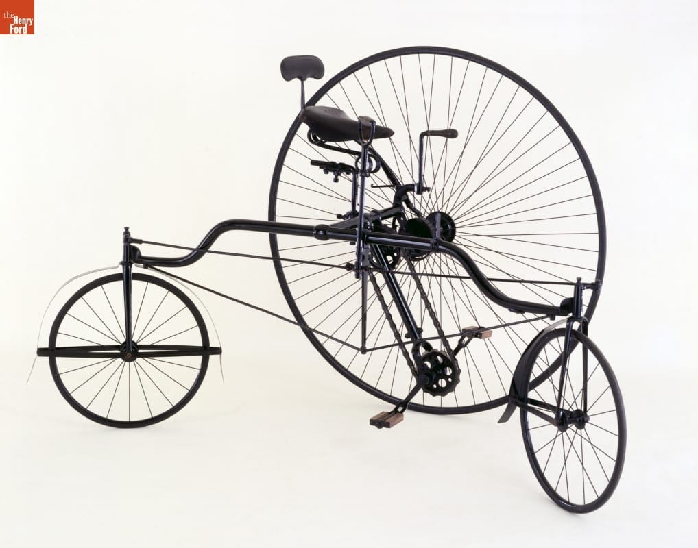 This chain-driven tricycle, made by Rudge Cycle Company in 1885, offered health and recreation options to those unable to mount high-wheel ordinaries. Tricycles provided an accessible seat and the stability of three wheels. And for many Victorian women, tricycles allowed them the chance to pedal down the street in dresses rather than in unconventional clothing like bloomers.