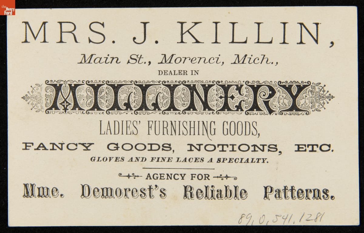 As color printing gained momentum in the late 19th century, trade cards became a major means of advertising goods and services. Americans enjoyed and often saved the little advertisements found in product packages or distributed by local merchants. This trade card advertises Mrs. Killin's millinery in Morenci, Michigan.