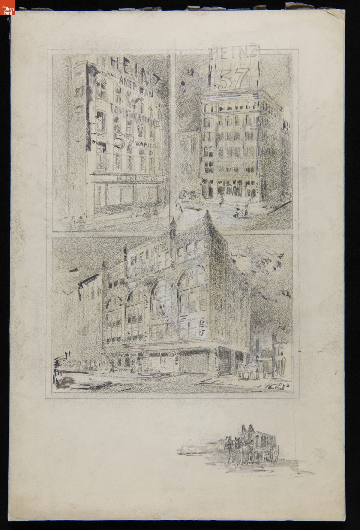 In 1869, H.J. Heinz began his career in the processed food industry exclusively selling horseradish. His product line quickly expanded to include pickled foods, preserves, and condiments, becoming a household name by the turn of the century. This success allowed operations to expand across the country. This drawing depicts several distribution branches, each with their own accounting department, delivery system, and corps of traveling salesmen.