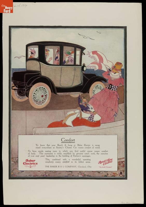 The Baker R&L Company, a merger of two electric vehicle companies, created this advertisement in 1916. Clearly aimed at well-to-do women, the ad touted the vehicle's "comfort." Ample room certainly meant comfort, but the ad's text reminded the reader of another meaning, "a wonderful operating simplicity." Many electric vehicle companies used this simplicity to target sales to society-conscious women.