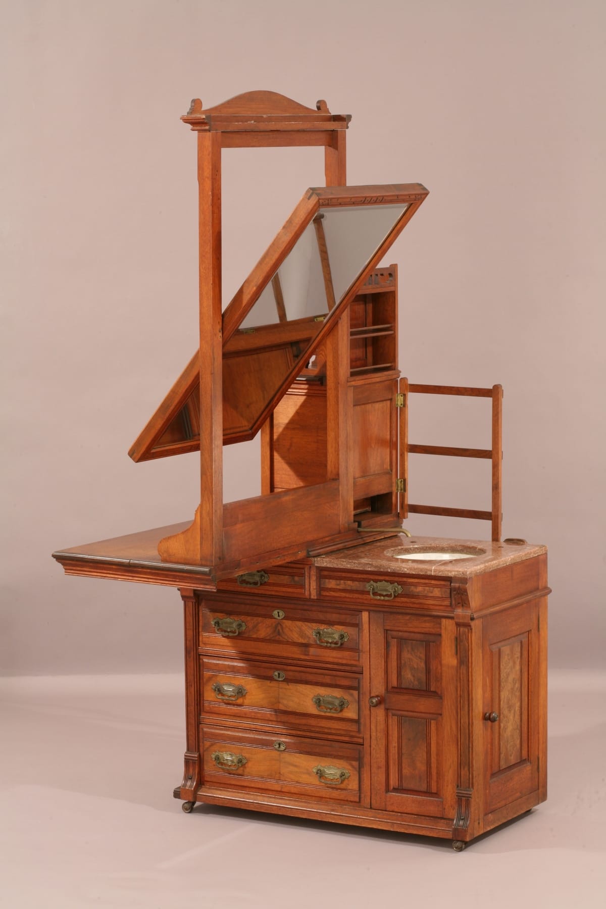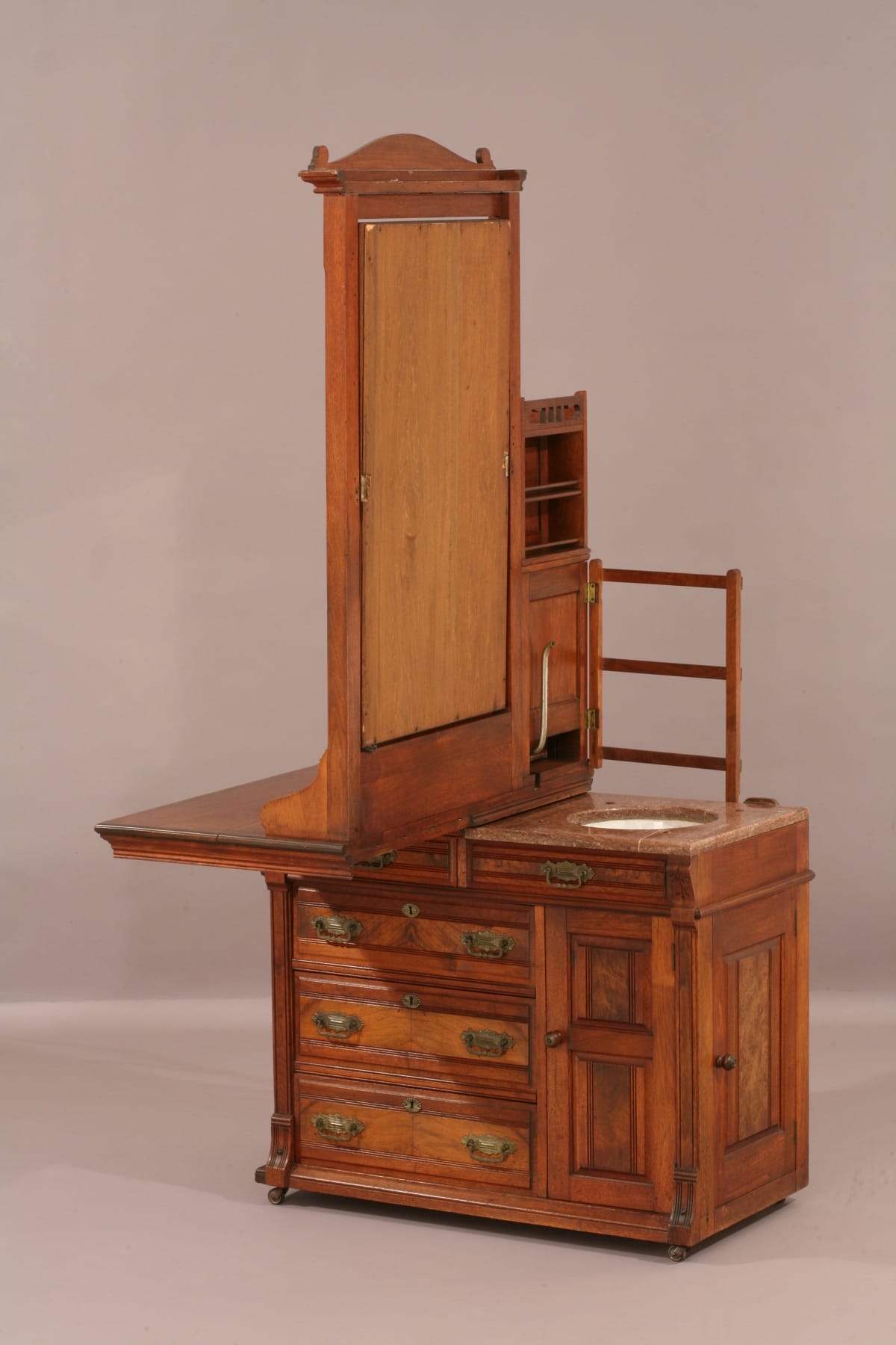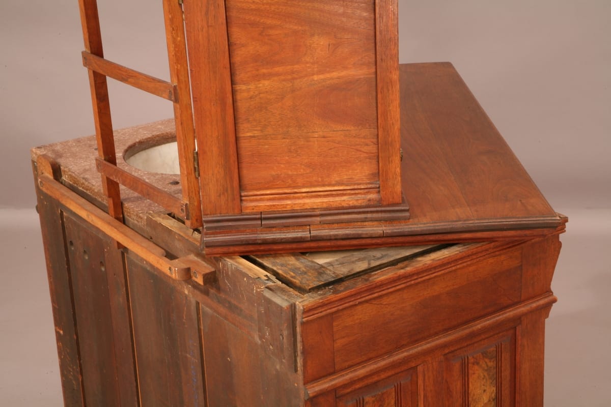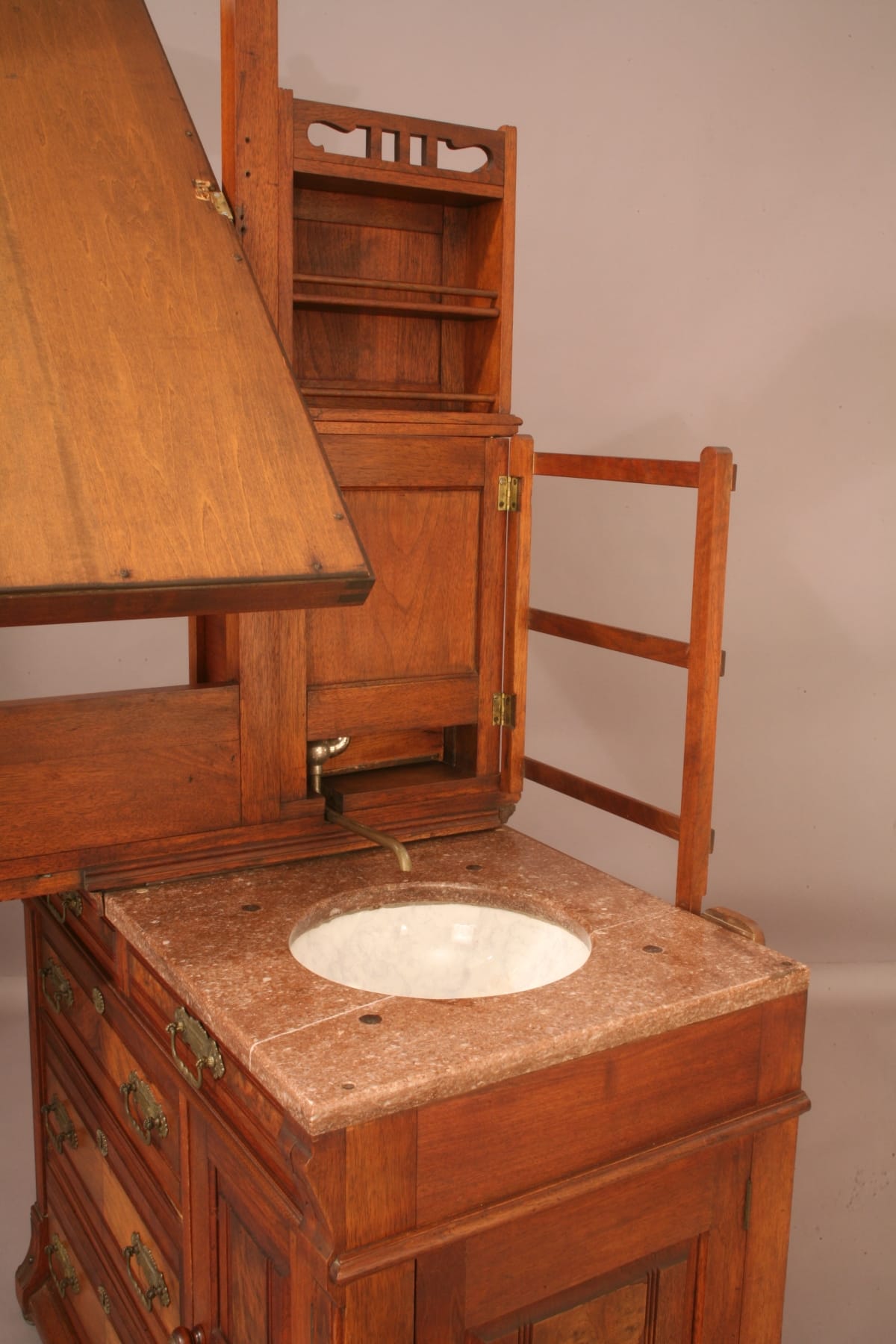 This ingeniously designed dressing case was used in a rural hotel without indoor plumbing. It hides a complete, self-contained washing system behind its stylish exterior.