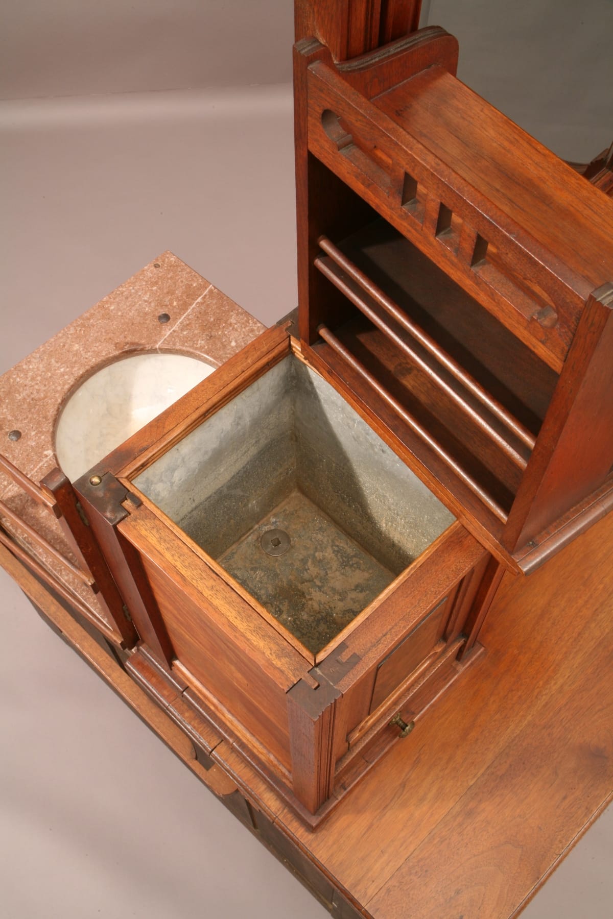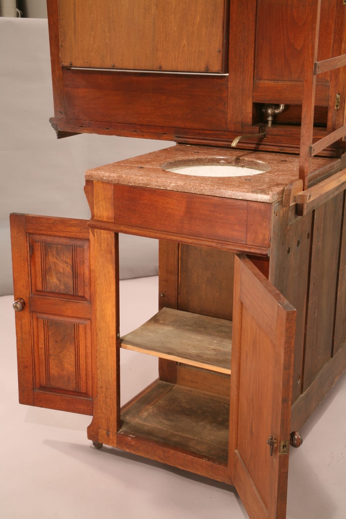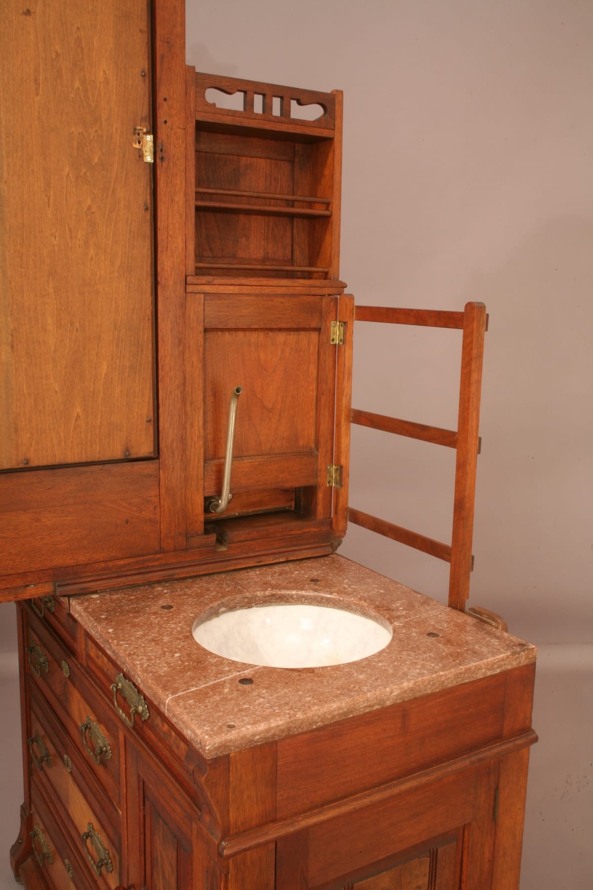 This ingeniously designed dressing case was used in a rural hotel without indoor plumbing. It hides a complete, self-contained washing system behind its stylish exterior.