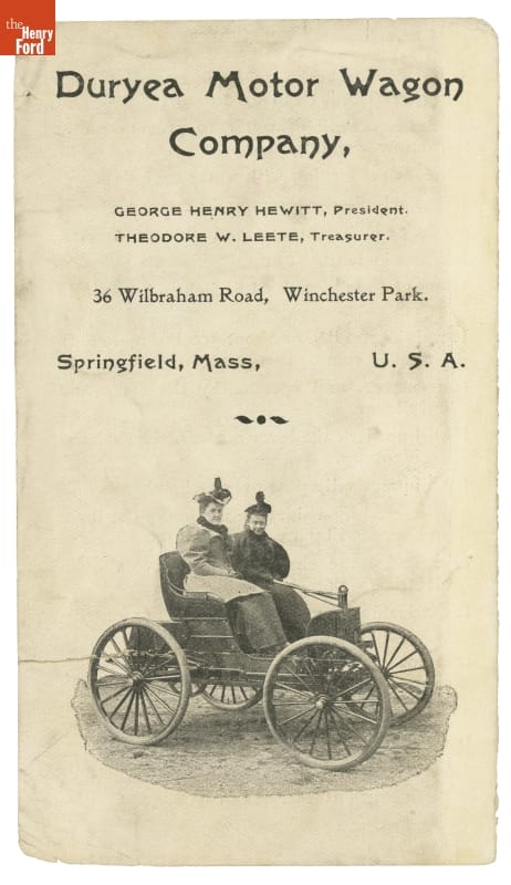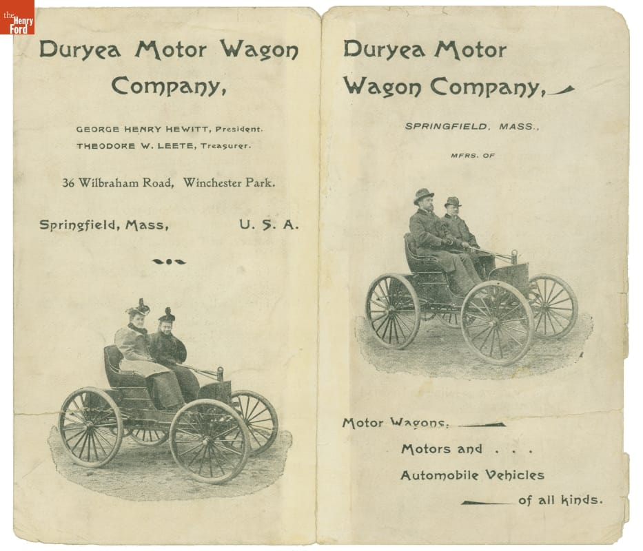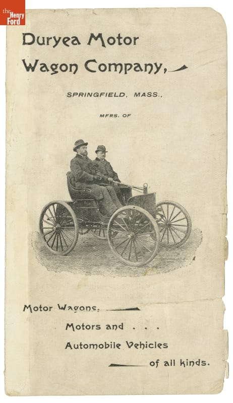 This 1896 brochure promoted the Duryea Motor Wagon Company. Duryea became the first in America to produce a series of identical vehicles, an accomplishment that marked the beginning of the U.S. auto industry. They made 13 vehicles in their first year.