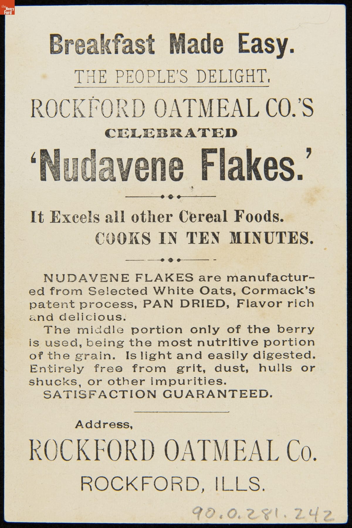 Trade Card for Nudavene Flakes, Rockford Oatmeal Co., 1891-1900