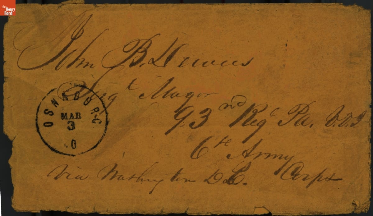On back, upper left corner, is another message, also written by George Dewees: Keep in good cheer and God will not allow the wicked to conquer, Give my best respects to all your brave companions in your Company and Regiment (the Gallant 93rd) if I could only stand by you Shoulder to Shoulder I would try to give them Hell. Three cheers for Lincoln and Gen. Grant and his Army.