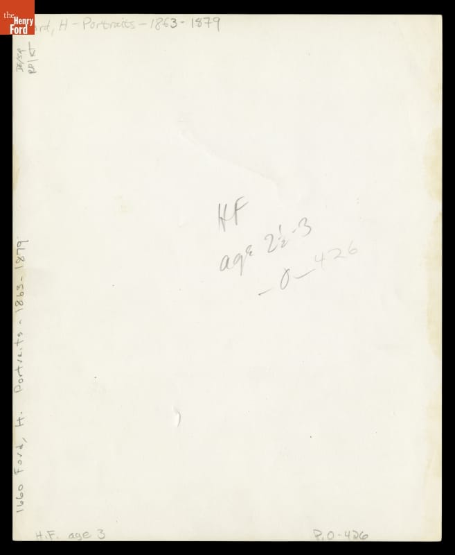 Henry Ford was born July 30, 1863, and he was no more than three years old when he posed for his first photographic portrait. His parents, William Ford and Mary Litogot Ford, had lost their first son at birth in January 1862, but Henry arrived safe and sound. He was followed by five siblings: John, Margaret, Jane, William, and Robert.