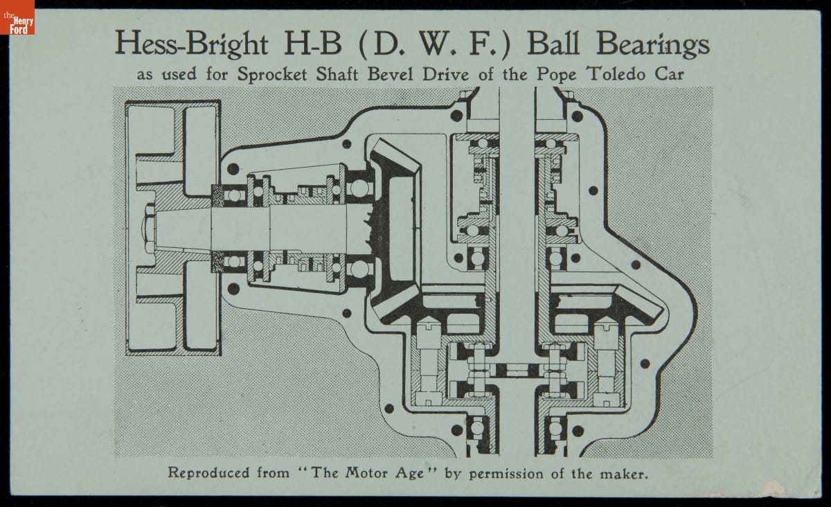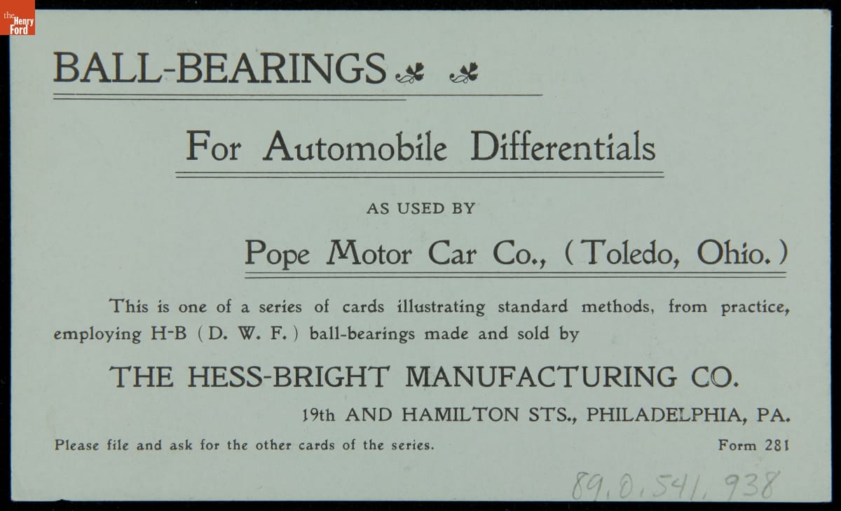 Trade Card, Ball Bearings as Used for Sprocket Shaft Bevel Drive of the Pope Toledo Car, Hess-Bright Manufacturing Co., circa 1905