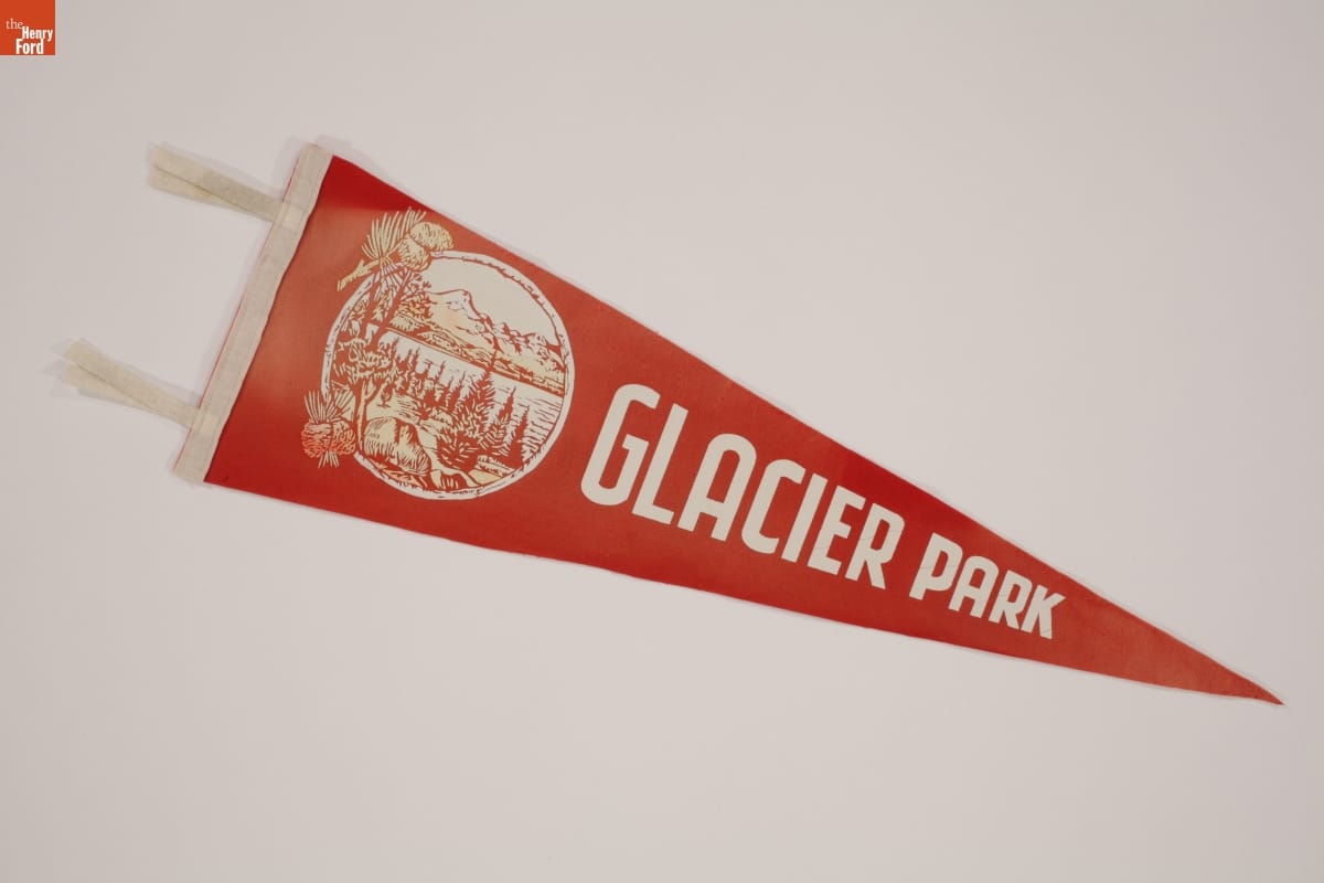 Travelers often return home with souvenirs that serve as tangible reminders of places visited. Felt pennants were a popular choice of vacationing Americans in the mid-1900s. This example is from Glacier National Park in northern Montana. It depicts one of the park's glacial lakes and mountain vistas.