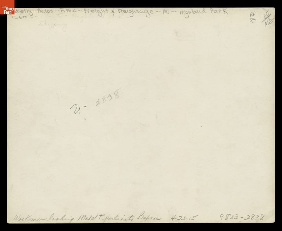 Four men were photographed loading a Model T body into a boxcar at Ford Motor Company's Highland Park plant in 1915. To save space, workers generally packed bodies and chassis separately. These boxcars belonged to the Lake Shore & Michigan Southern Railway, a subsidiary of the New York Central Railroad.