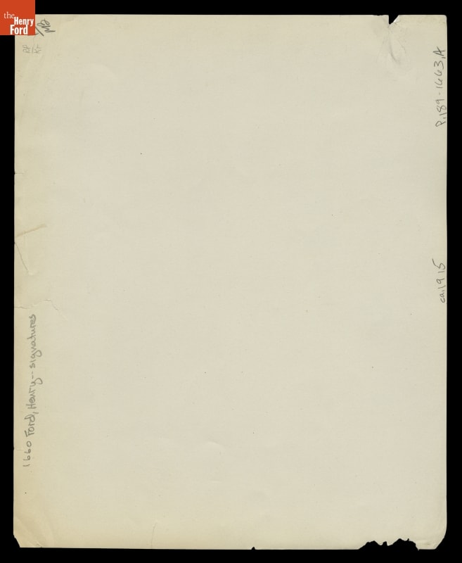 The signatures of some of Henry Ford's key associates are seen on this document. William B. Mayo designed the massive steam-gas generators that powered Ford's Highland Park plant, and later he was heavily involved in planning the Rouge complex. Ernest Liebold, Henry Ford's executive secretary, managed many of Ford's non-automotive enterprises, from Henry Ford Hospital to the DT&I Railroad.