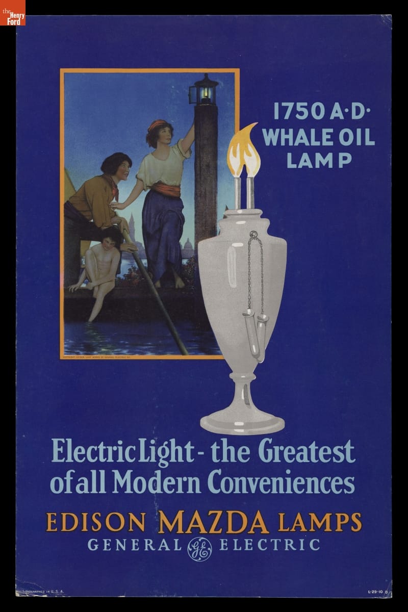 General Electric promoted its bright, long-lasting Edison Mazda light bulb through an advertising campaign featuring illustrations by artists including Maxfield Parrish and Norman Rockwell. Advertisements depicting the history and power of light ran in popular magazines like The Saturday Evening Post and Ladies' Home Journal. The images were also reproduced for point-of-purchase materials and posters like this one.