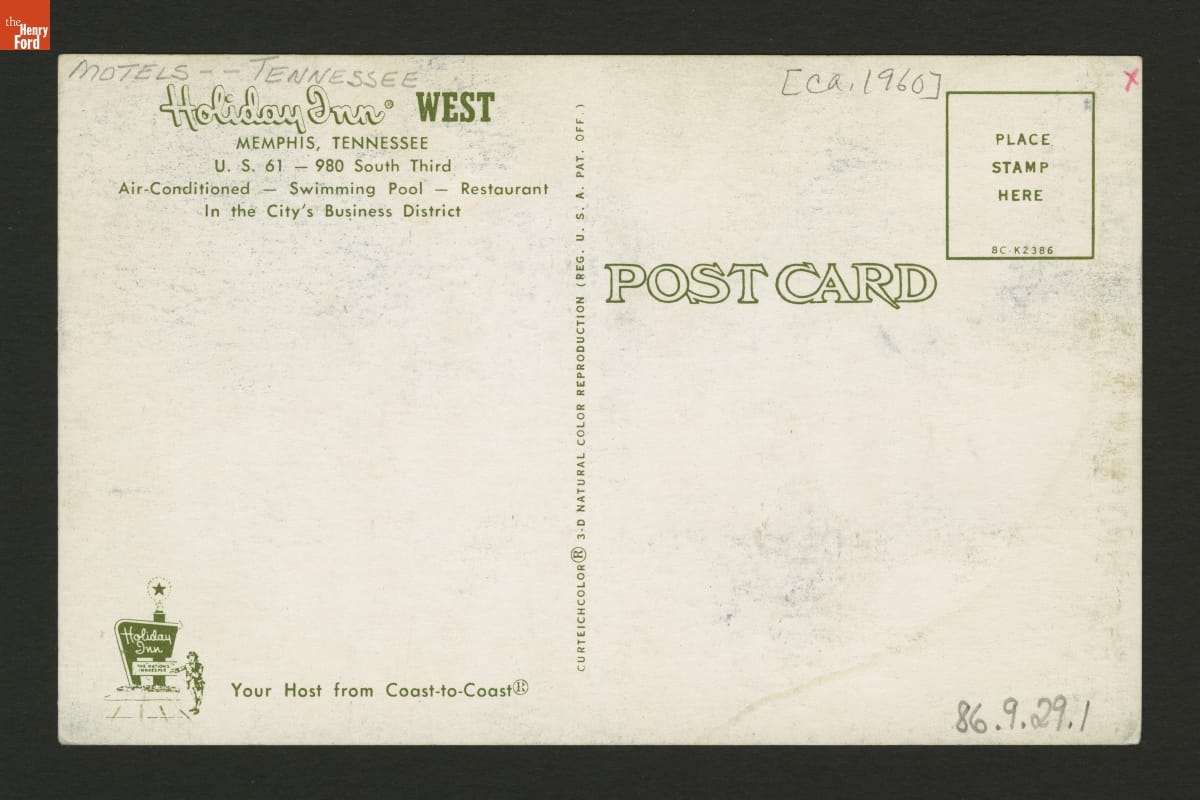 On verso: Holiday Inn WEST / MEMPHIS, TENNESSEE / U.S. 61 - 980 South Third / Air-Conditioned - Swimming Pool - restaurant / In the City's Business District