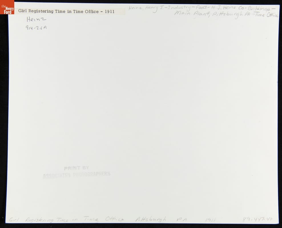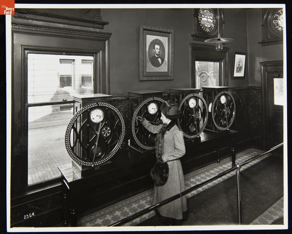 Woman Using Time Clock at the Main Plant, H. J. Heinz Company, Pittsburgh, Pennsylvania, 1911
