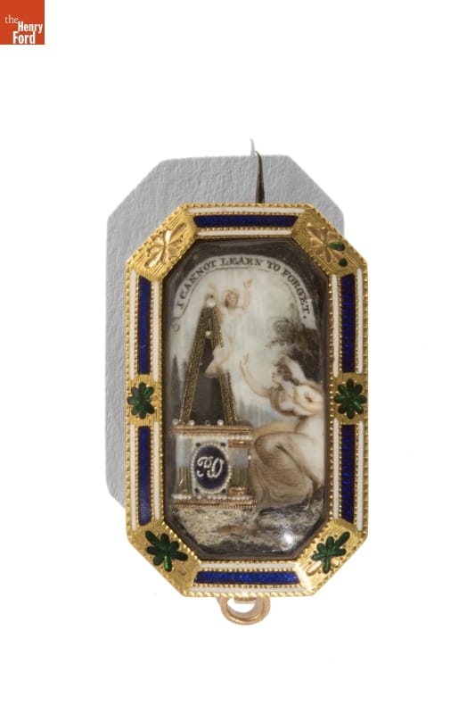 Before the 20th century, death came early and often. One way people coped was to wear jewelry as memorials to their loved ones. Over the centuries, mourning jewelry followed the prevailing fashions. Shortly after independence, Americans favored illuminated, miniature brooches and pendants painted on ivory. These featured shapes derived from classical design, symbols such as urns and weeping women dressed as ancient Romans.